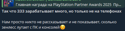 >Похоже, zzz выиграла награду PlayStation Awards, и, поскольку она присуждается на основе доходов, это означает, что она по-прежнему успешна на консолях и ПК, а не на мобильных устройствах. Те самые миллионы с консолей и пк которые не учитываются в табличке. Верю, верю