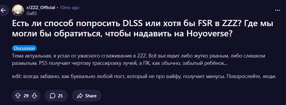 Хотел недавно зюзю скачать до эндфилда перекантоваться, но погуглил в игре по сей день в 2к2026 году нет ДЛСС. Поэтому скачал вуву, если че не тролинг реальная история. Пишите в опросниках про длсс сколько можно терпеть это ж пк игра макс репост.