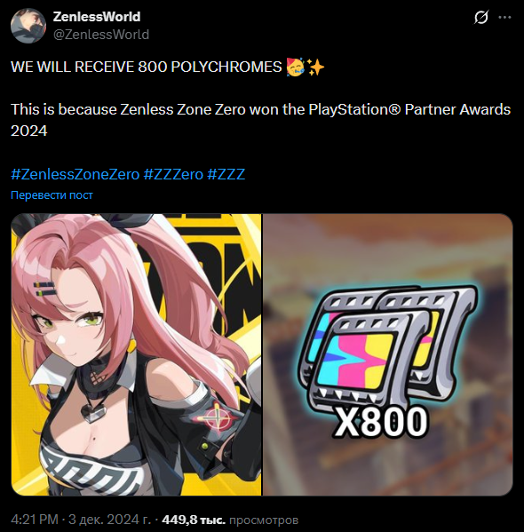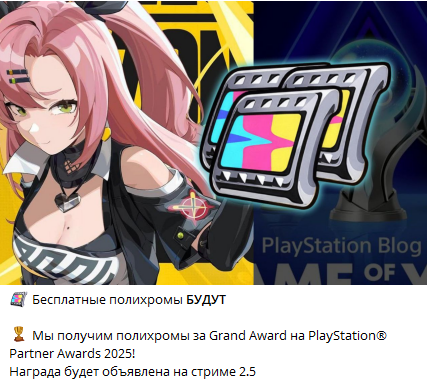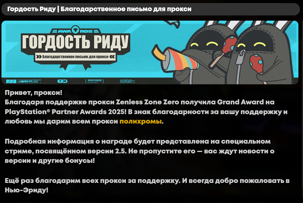 Привет, прокси! Благодаря поддержке прокси Zenless Zone Zero получила Grand Award на PlayStation® Partner Awards 2025! В знак благодарности за вашу поддержку и любовь мы дарим всем прокси полихромы.