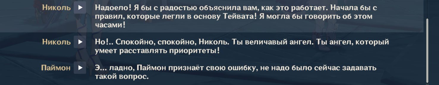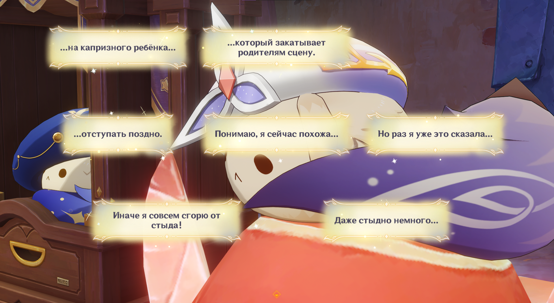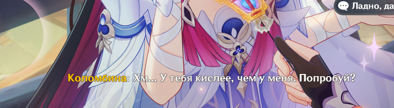 какой же филлерный кал, напихали кучу чемпиков невпопад. выкинь нефер или дулина из сюжетки ниче не поменяется в нодкале. ввели кучу старых хайповых персов типа алисы и варки, а их роль чисто пошутить над паймон и потусоваться на фоне. даже встречи с колумбиной и ее сверхбанальная сюжетка утомили, и это при том что у них перед глазами более удачный пример кирены из хонкала, который несмотря на лучшее исполнение тоже чересчур затянулся и не дал нужного эффекта. реально над г как будто провинившихся стажером поставили работать. еще небось доктора в некст патче бездарно сольют максимально клишированным и унылым образом.