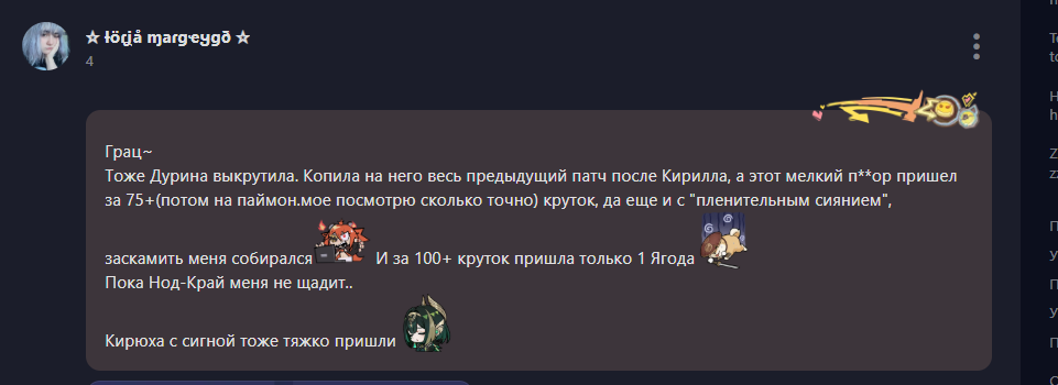 >>5992979 СУКАААА ААААА ты что наделал… Решил вкинуть ещё тенролл в баннер, раз уж так - и сработало это офигительное сияние за 3 предыдущих проигрыша коинфлипа… Ох, ладно. С другой стороны, 3 тенролла в баннер в сумме вышло, и пити было меньше 10. Так что Дурин и С1 Ягода за меньше чем 40 круток - это наверное скорее вин. Вообще мне Николь из ведьм только интересна, а она, если гео, то меньше всех наверное с Дуриным синергирует.