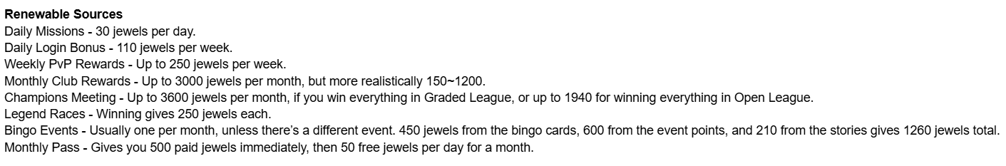 >>6010609 >>6010647 Может раз в неделю тебе гарант дают, хуесос? Или ты проецируешь свой опыт игры в первый месяц, когда насыпают одноразовых наград на всю игру? Кушай: Renewable Sources Daily Missions - 30 jewels per day. Daily Login Bonus - 110 jewels per week. Weekly PvP Rewards - Up to 250 jewels per week. Monthly Club Rewards - Up to 3000 jewels per month, but more realistically 150~1200. Champions Meeting - Up to 3600 jewels per month, if you win everything in Graded League, or up to 1940 for winning everything in Open League. Legend Races - Winning gives 250 jewels each. Bingo Events - Usually one per month, unless there’s a different event. 450 jewels from the bingo cards, 600 from the event points, and 210 from the stories gives 1260 jewels total. Monthly Pass - Gives you 500 paid jewels immediately, then 50 free jewels per day for a month.