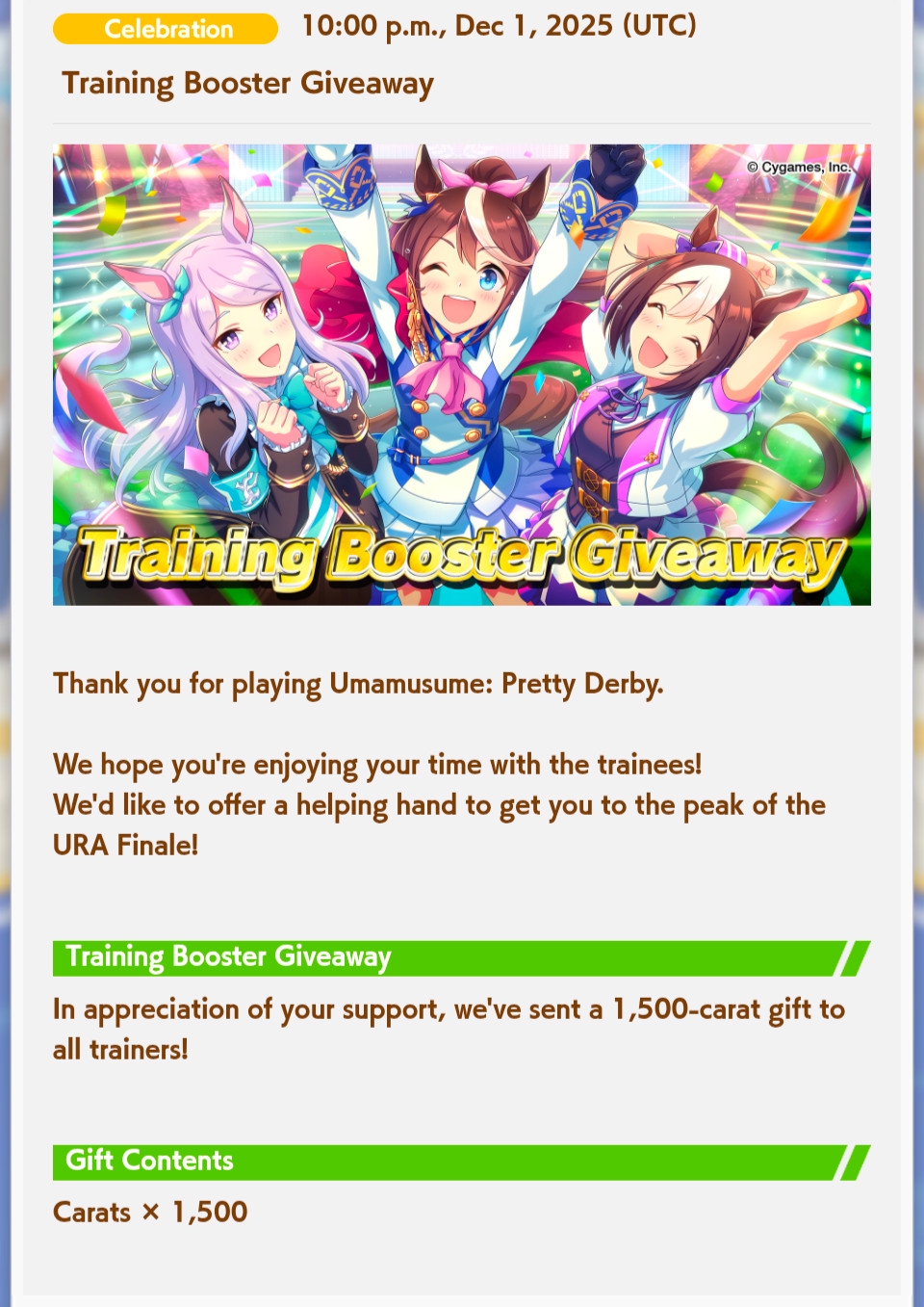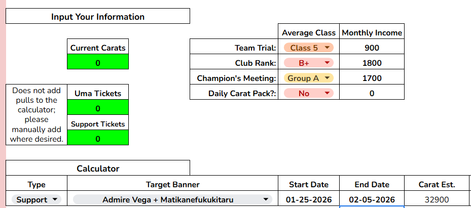 >>6014531 >The calculator assumes you obtain all freely available carats (daily login bonuses, daily missions, event missions, etc.). Things excluded include, but are not limited to: things we can't account for like Cygames' random carat gifts; carats from Team Trials gift boxes; carats obtained during careers; Обтекай.