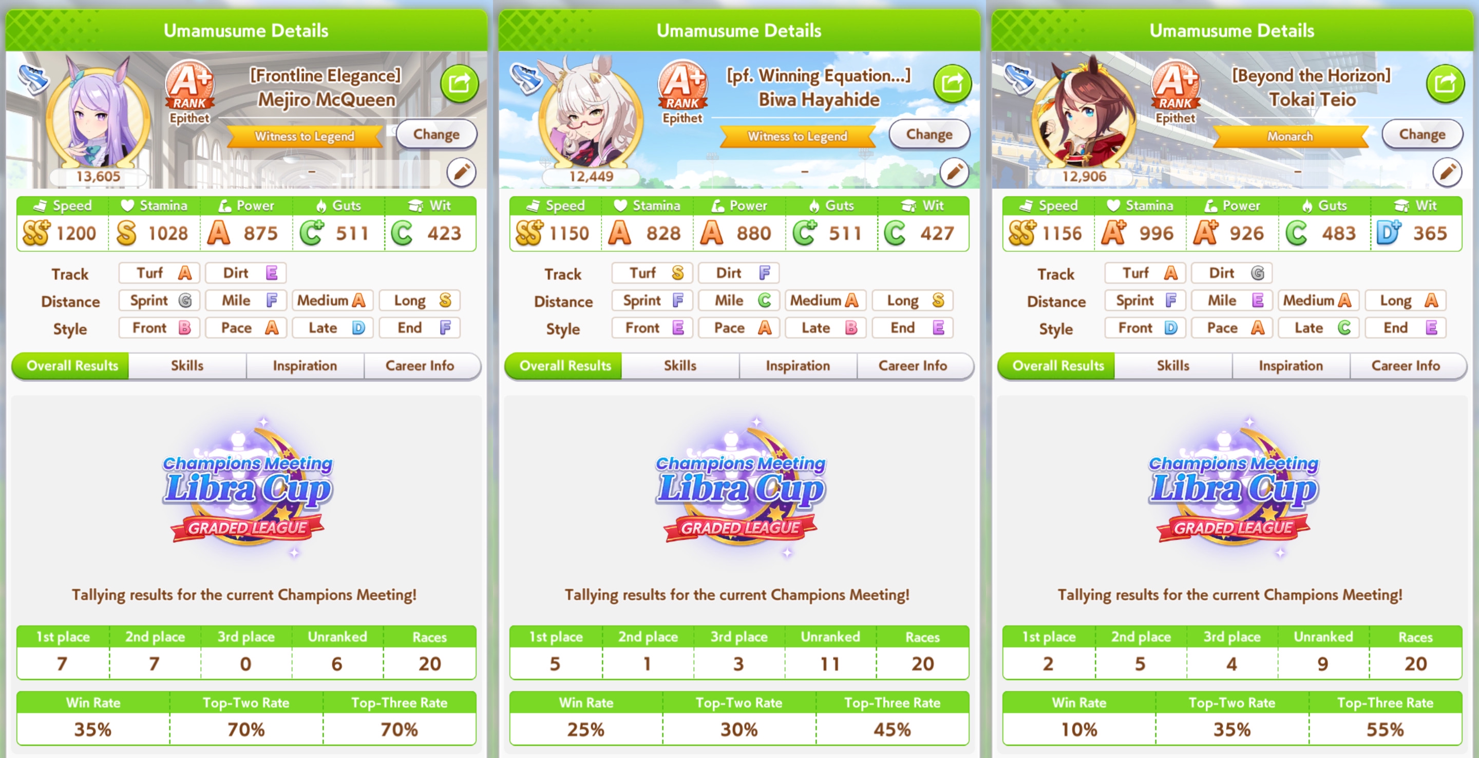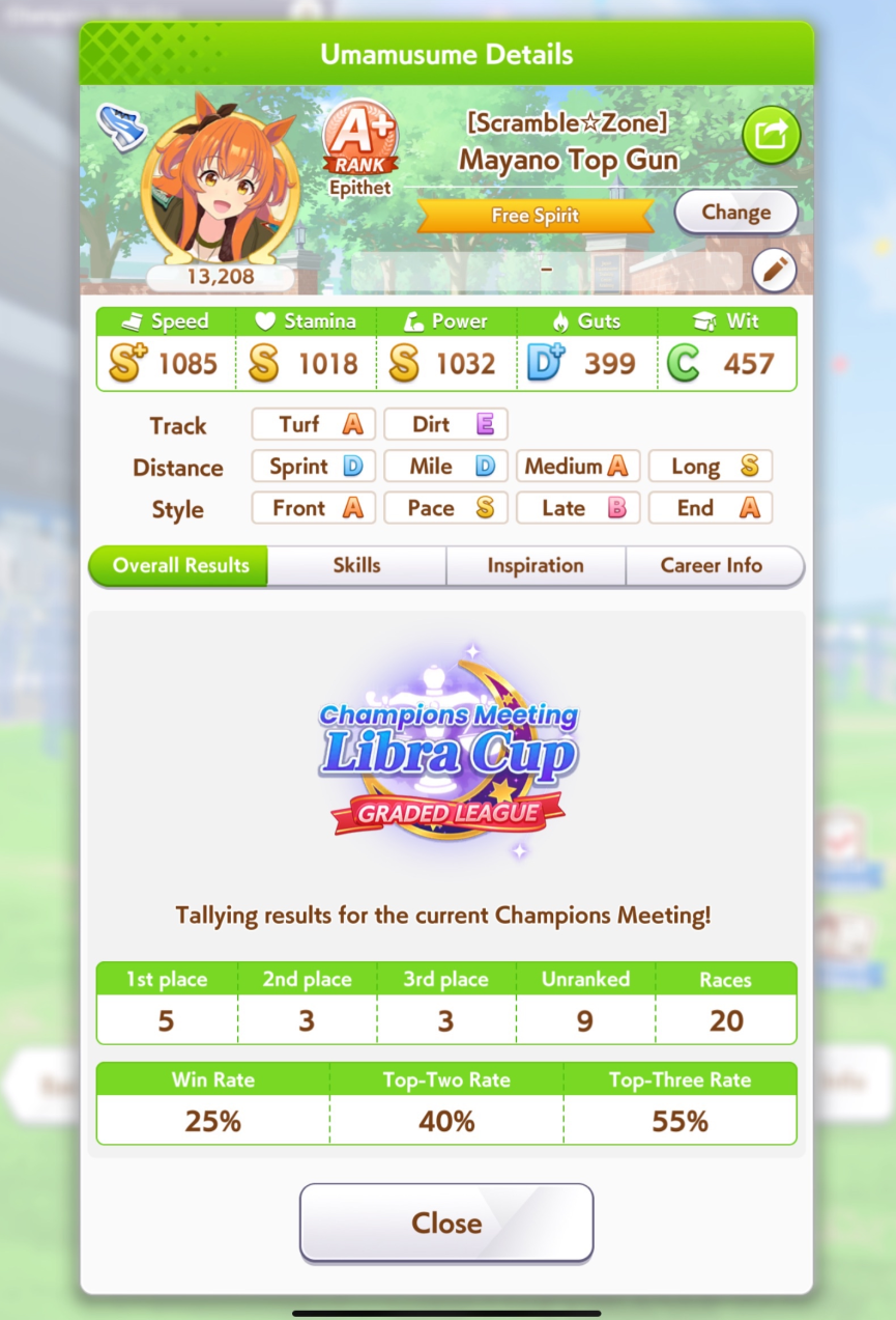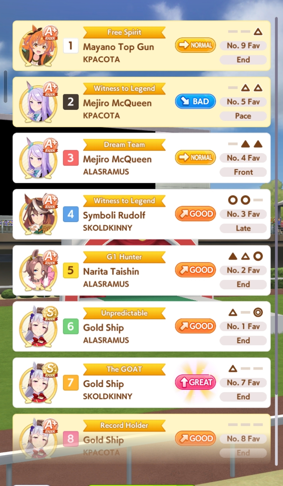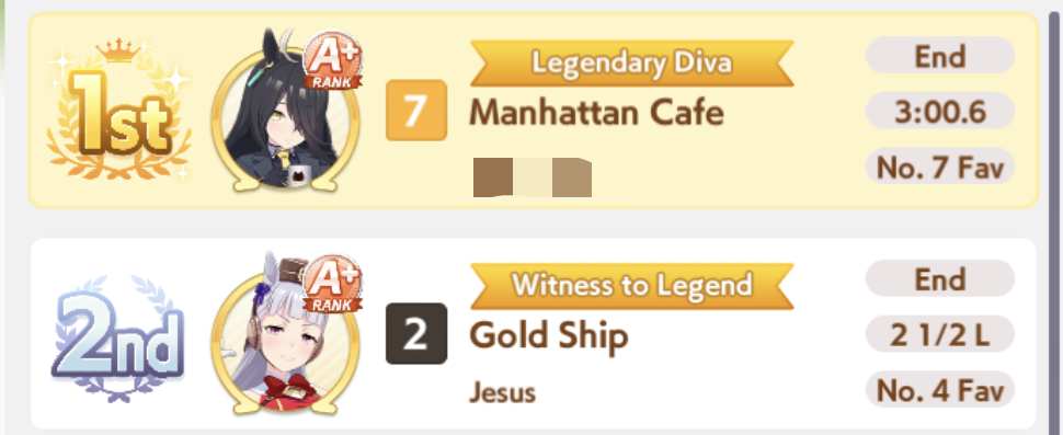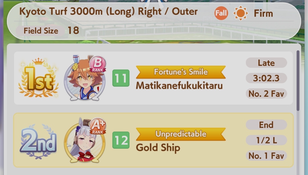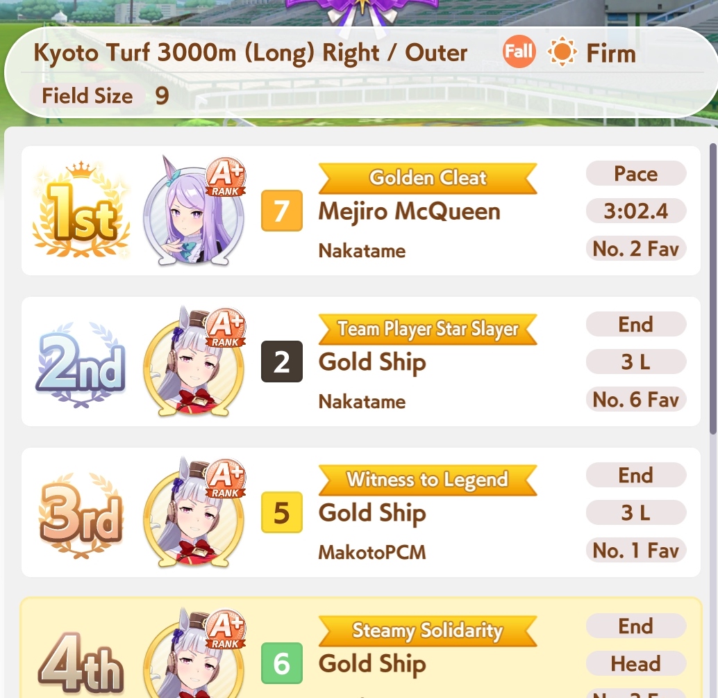 Но в основном, много людей с плохими лошадками, они пробивают 1200 в спд, но им откровенно не хватает стамины и павера. Кто пробивает стамина минимум с рекавери скиллами, у тех спида и павера не хватает. Во втором раунде по любому иначе будет, но самые слабые лошади, что я когда-либо видел в ЦМе в среднем. Всё-таки лонг - это реально стат чек, а не скилл чек. 1100 1000 1000 более чем хватает, чтобы выигрывать. Но есть одно но - это должна быть Голши или Тайшин. У меня слишком малая выборка, но вот реально, ноль шансов у кого-то ещё при прочих равных. Кафэшек прилично, но её тренить куда сложнее, хрен ты выбьешь статы как у Голши за 3 дня. Зачем я только время тратил на Огурца, вот реально, даже сильная Огури ничего не может против Голши. Весь топ в Голши, Огурец 3-5. Пэйсам пиздец как нужны акселерейшен скиллы, если оценивать по Японии, уже больше полугода класс только на медиумах и милях коупить может. Практически уверен, что лучше взять дебафера скорости и ебать эндов, чтобы повысить шансы на победу Голши.