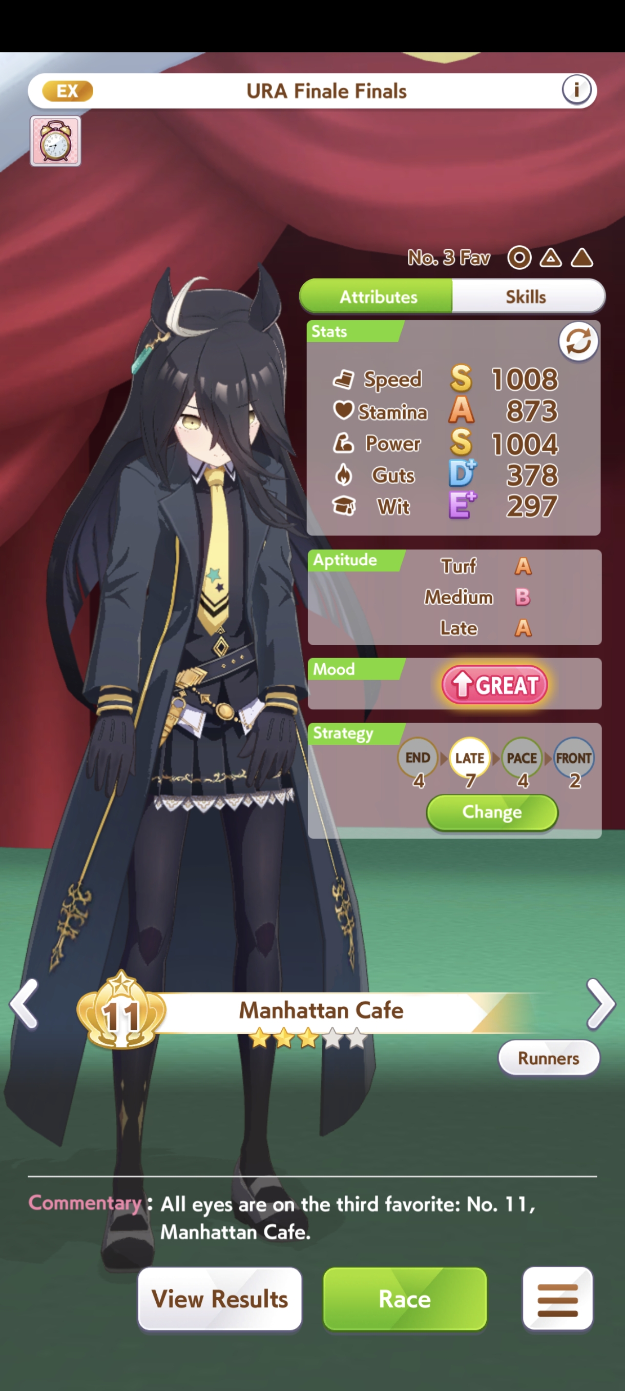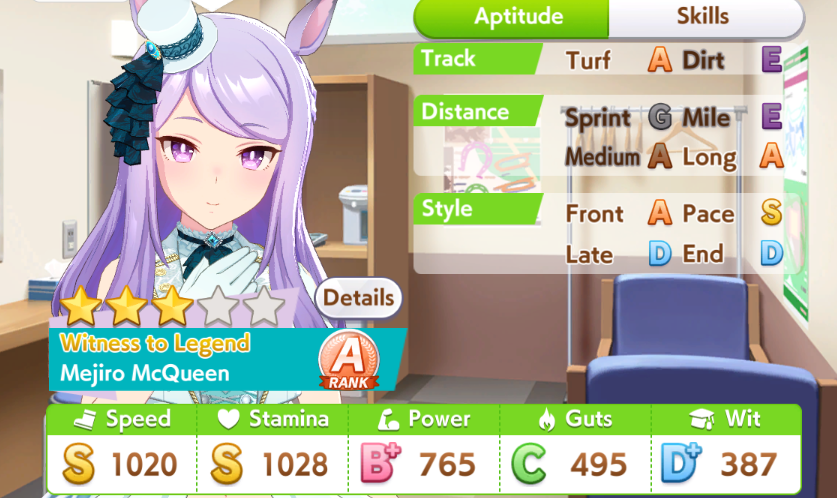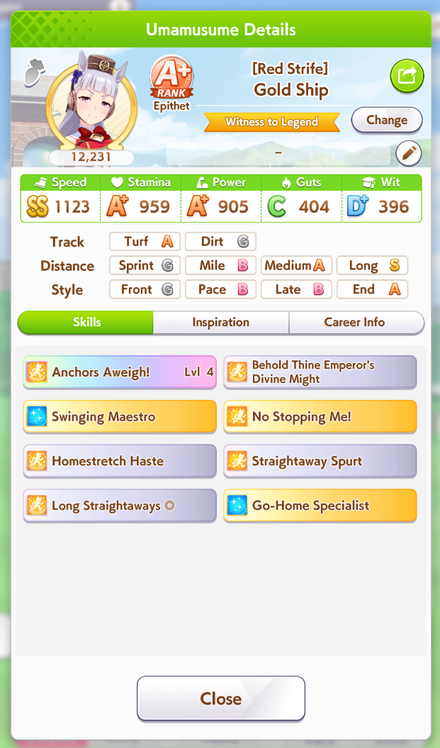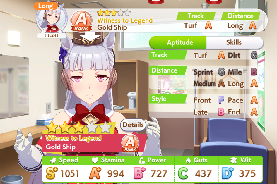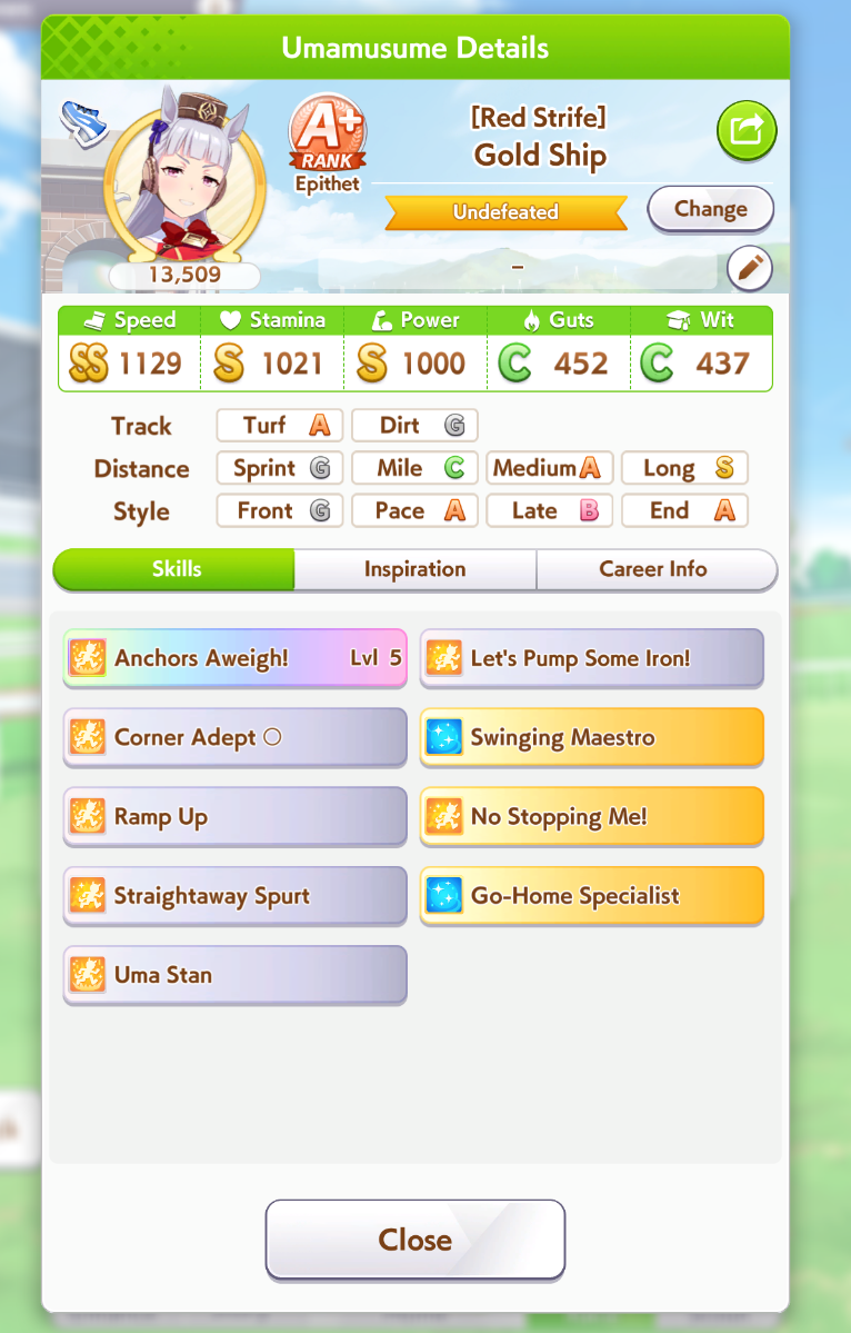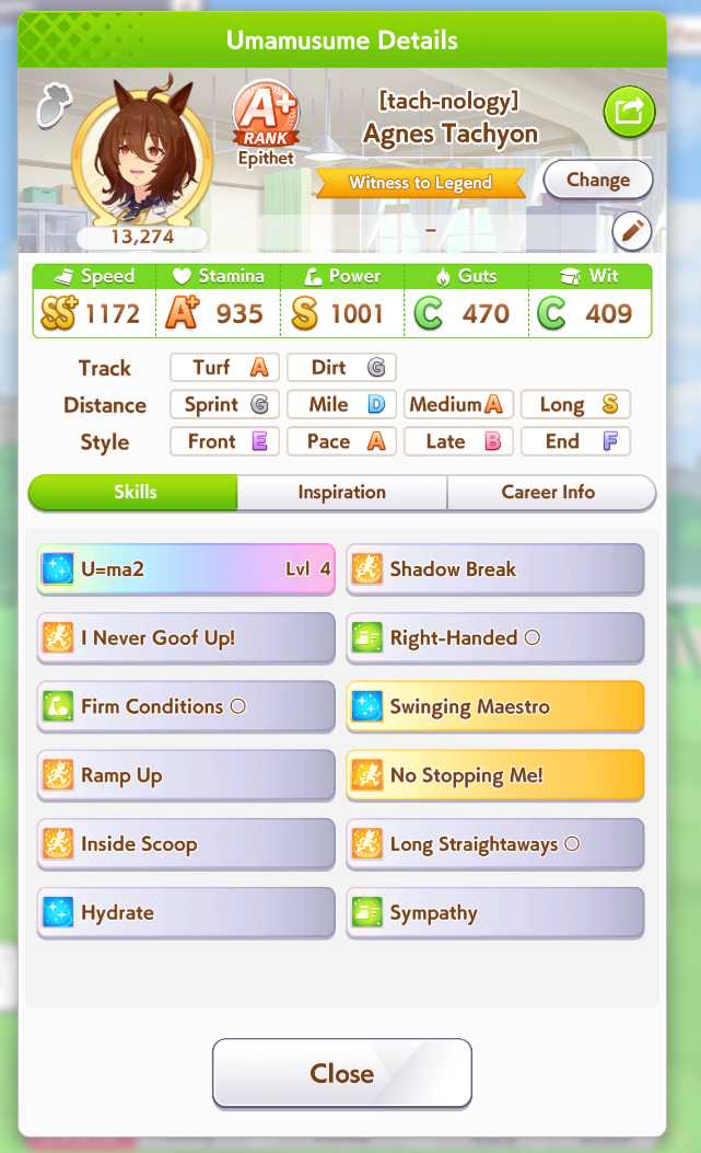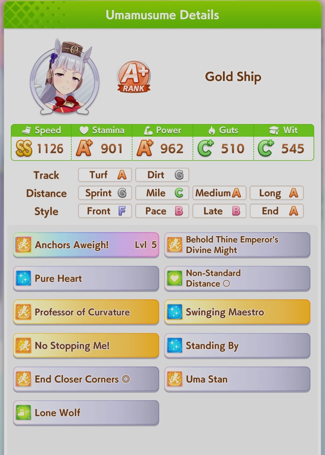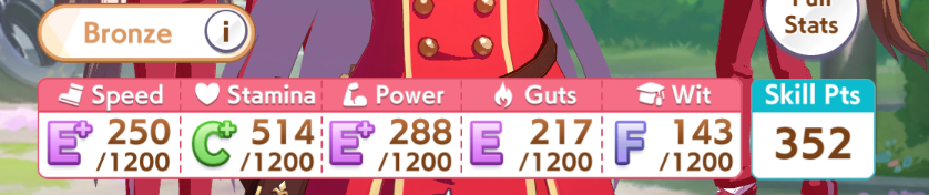 И на последнем месте даже с учетом недавнего бафа - гатс. Если к финишу бегут две +- одинаковые умы, то они борются за место благодаря гатсу, это что-то типо мотивации прибежать первее, на коротких дистанциях оно будет важнее стамины и мб важнее павы, но хз это только недавно ввели