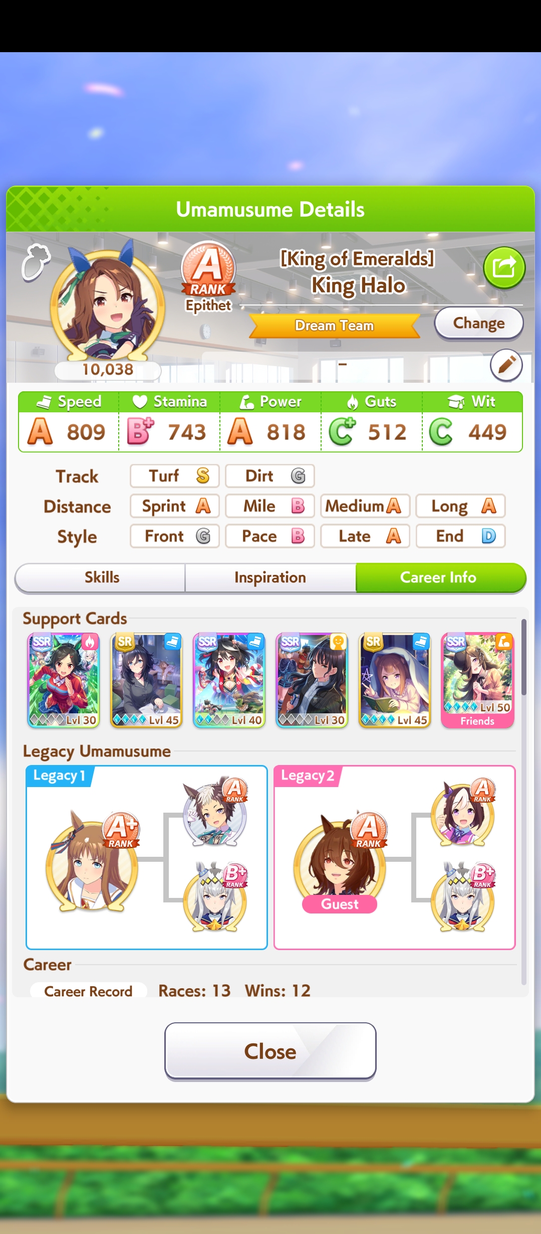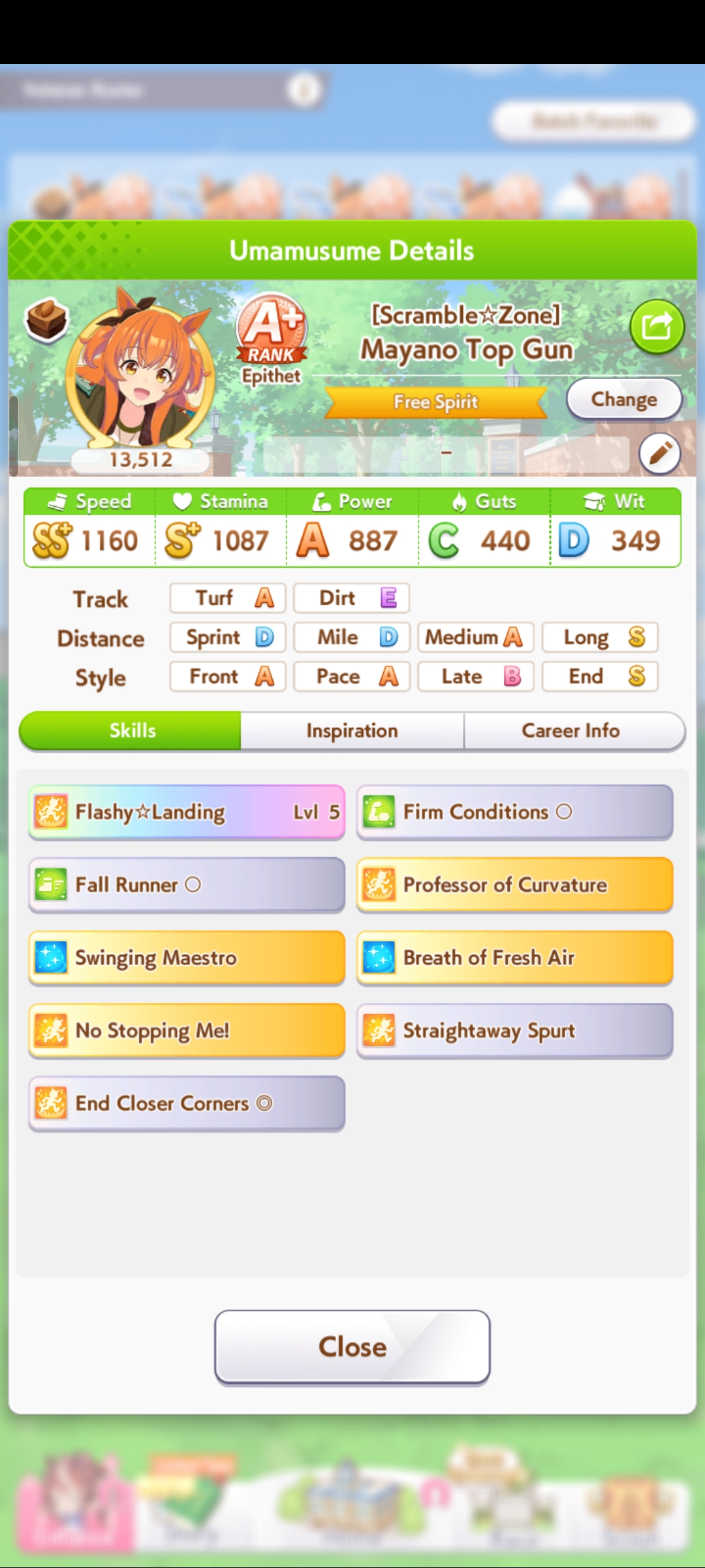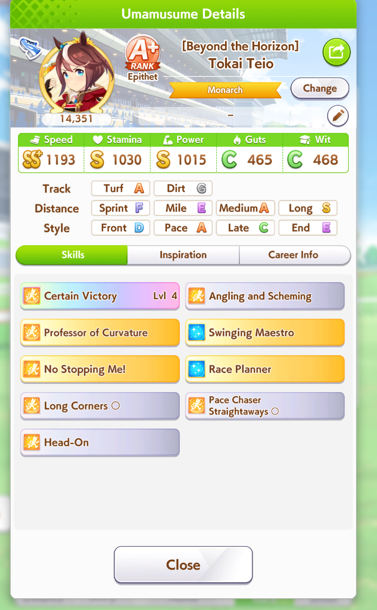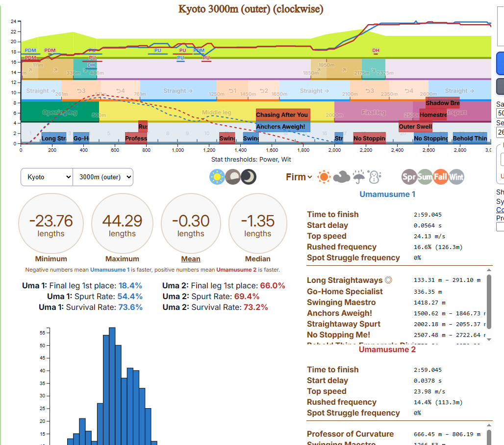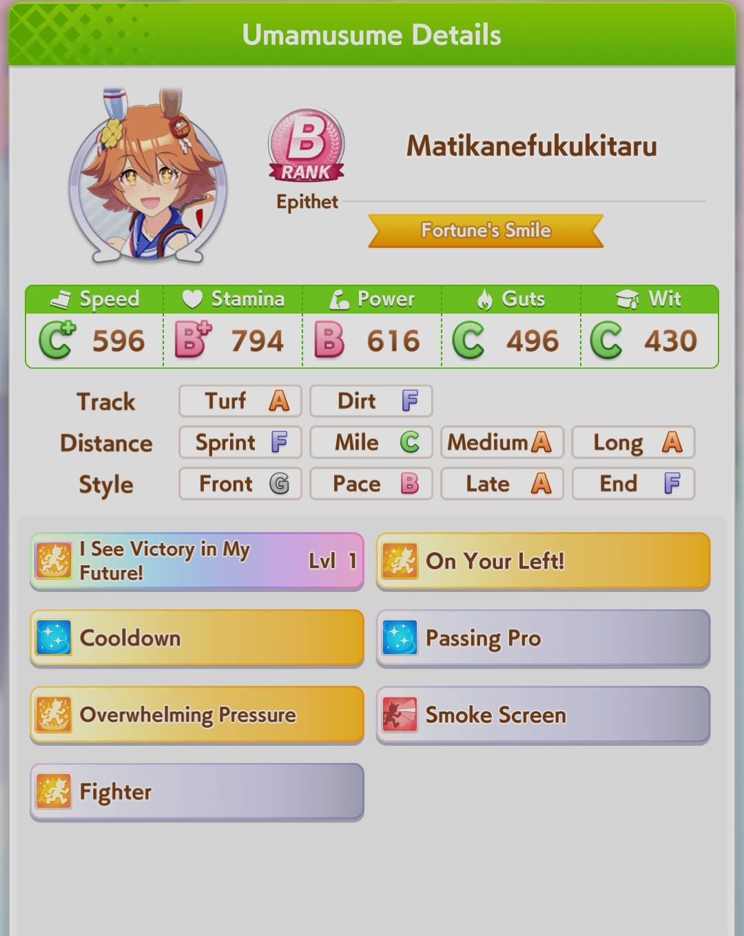 И на последнем месте даже с учетом недавнего бафа - гатс. Если к финишу бегут две +- одинаковые умы, то они борются за место благодаря гатсу, это что-то типо мотивации прибежать первее, на коротких дистанциях оно будет важнее стамины и мб важнее павы, но хз это только недавно ввели