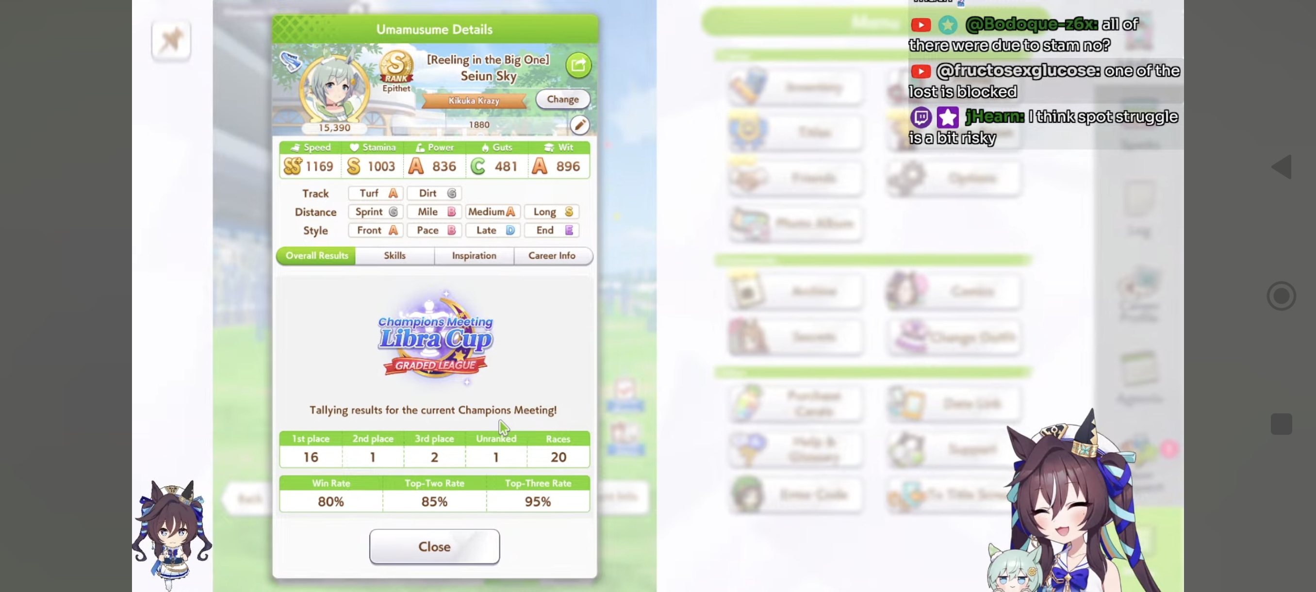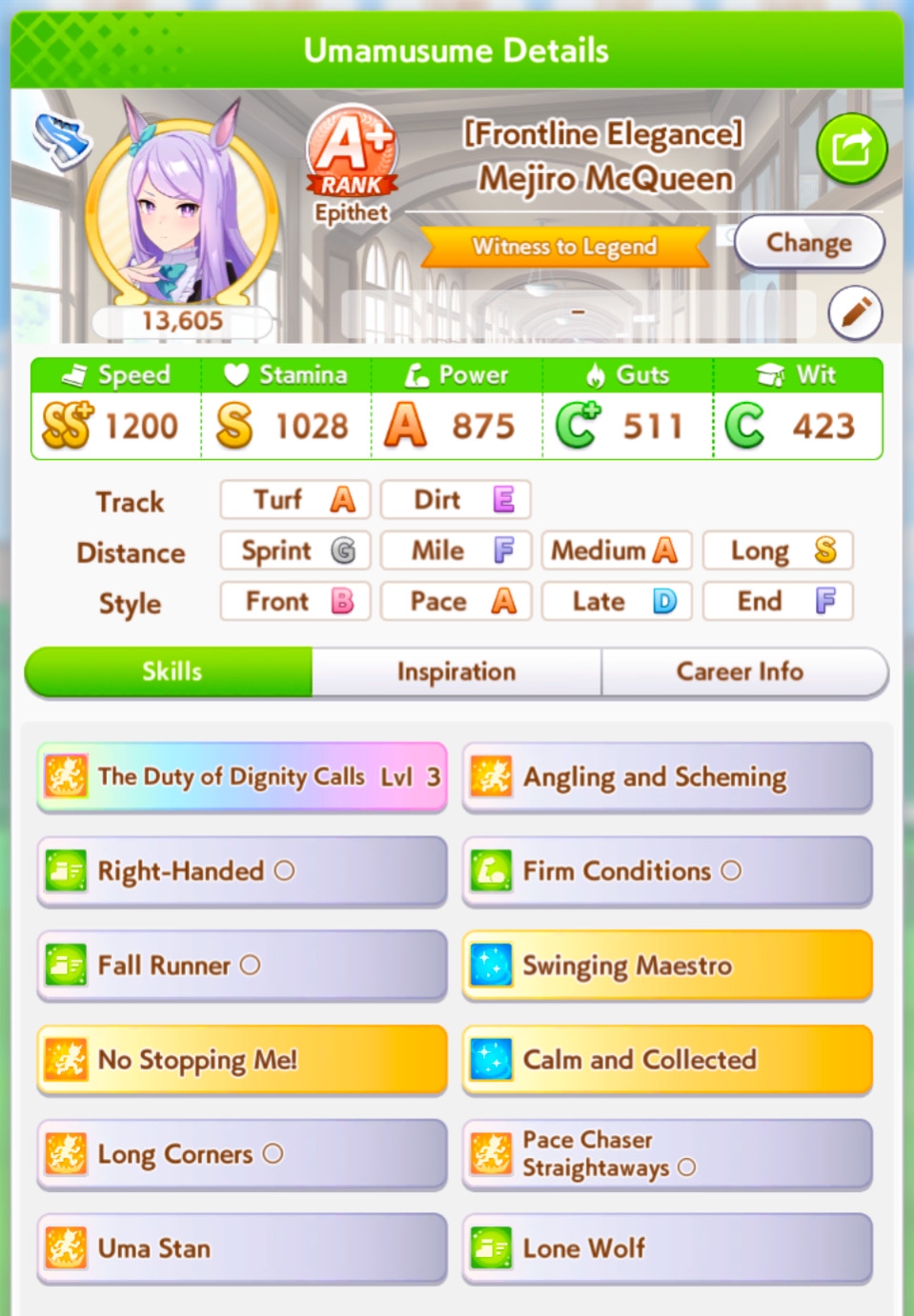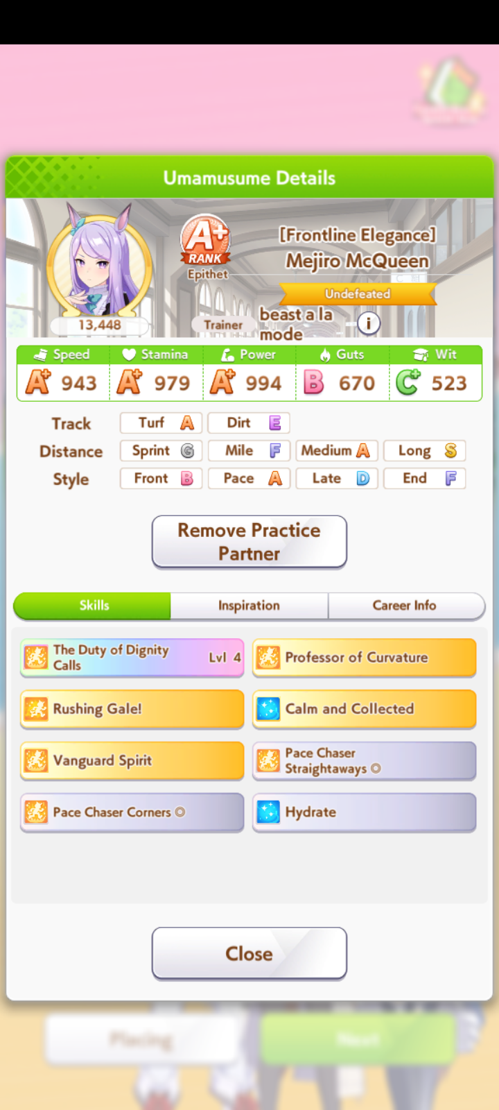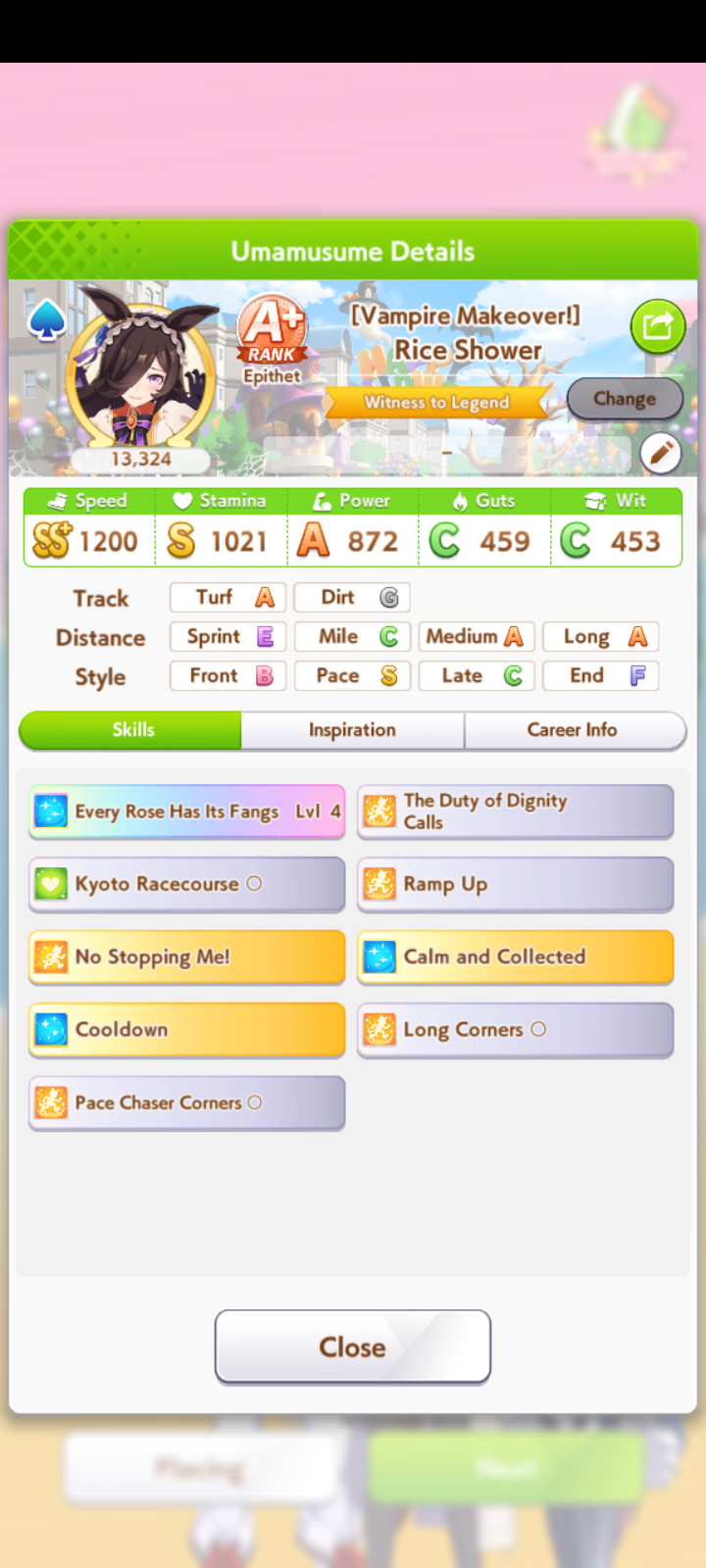 И на последнем месте даже с учетом недавнего бафа - гатс. Если к финишу бегут две +- одинаковые умы, то они борются за место благодаря гатсу, это что-то типо мотивации прибежать первее, на коротких дистанциях оно будет важнее стамины и мб важнее павы, но хз это только недавно ввели