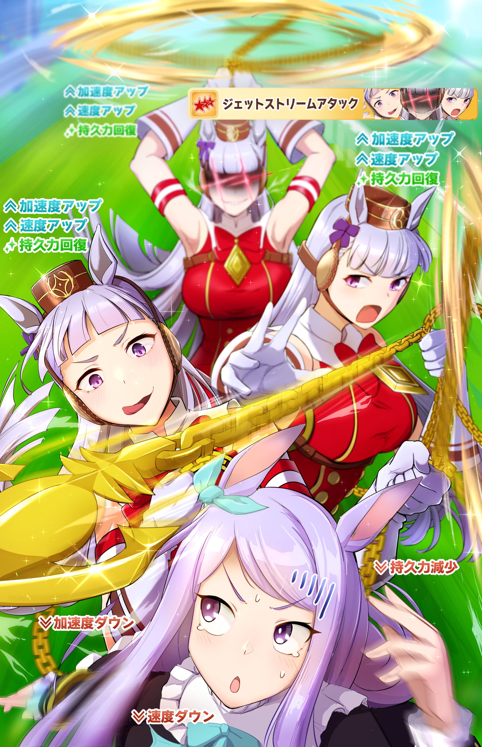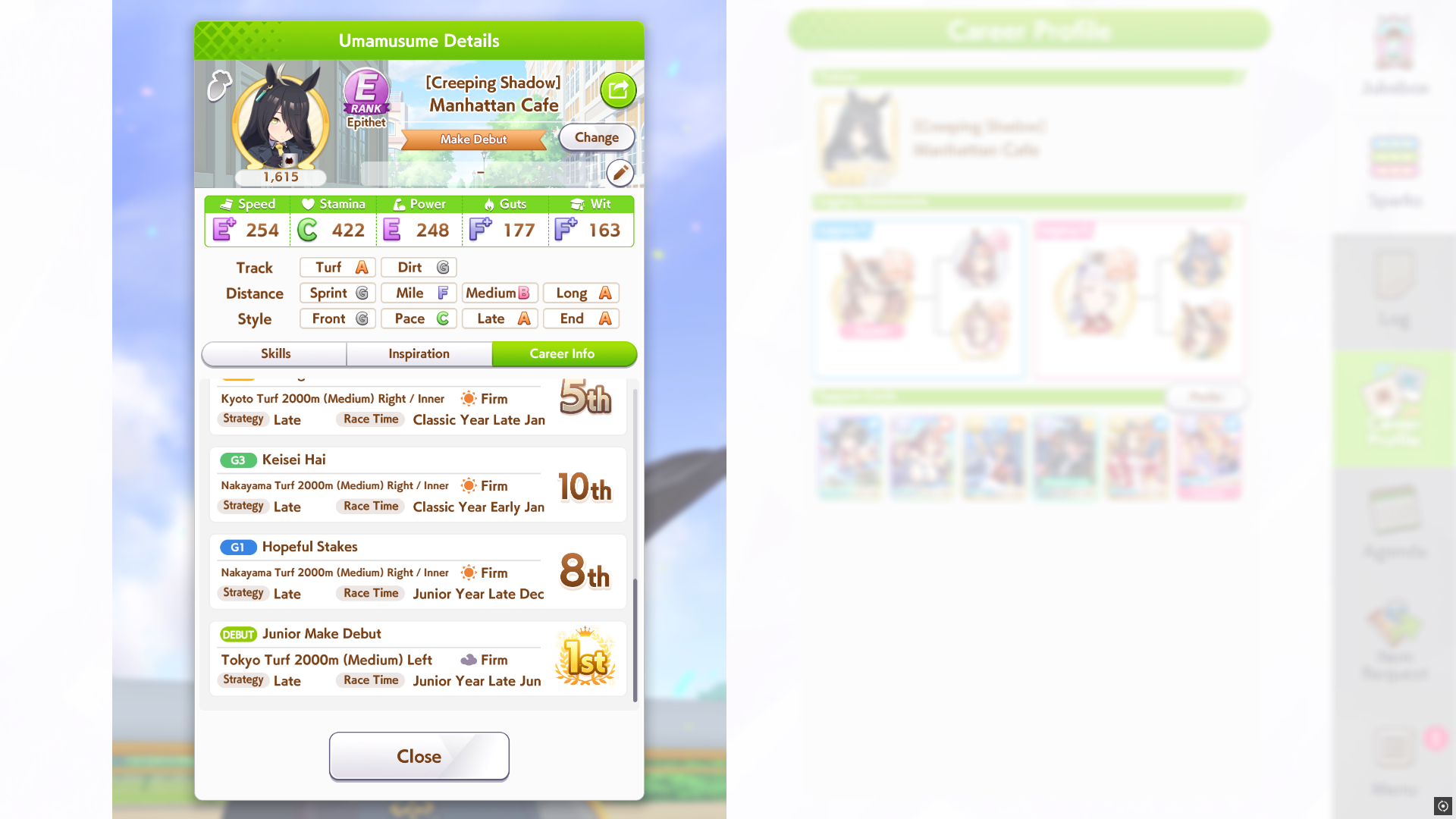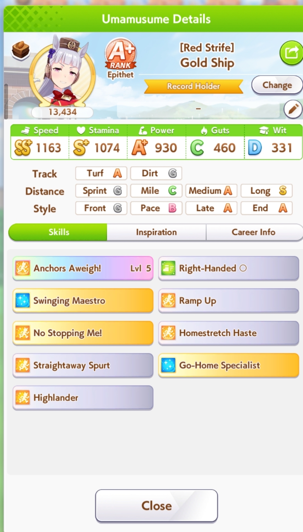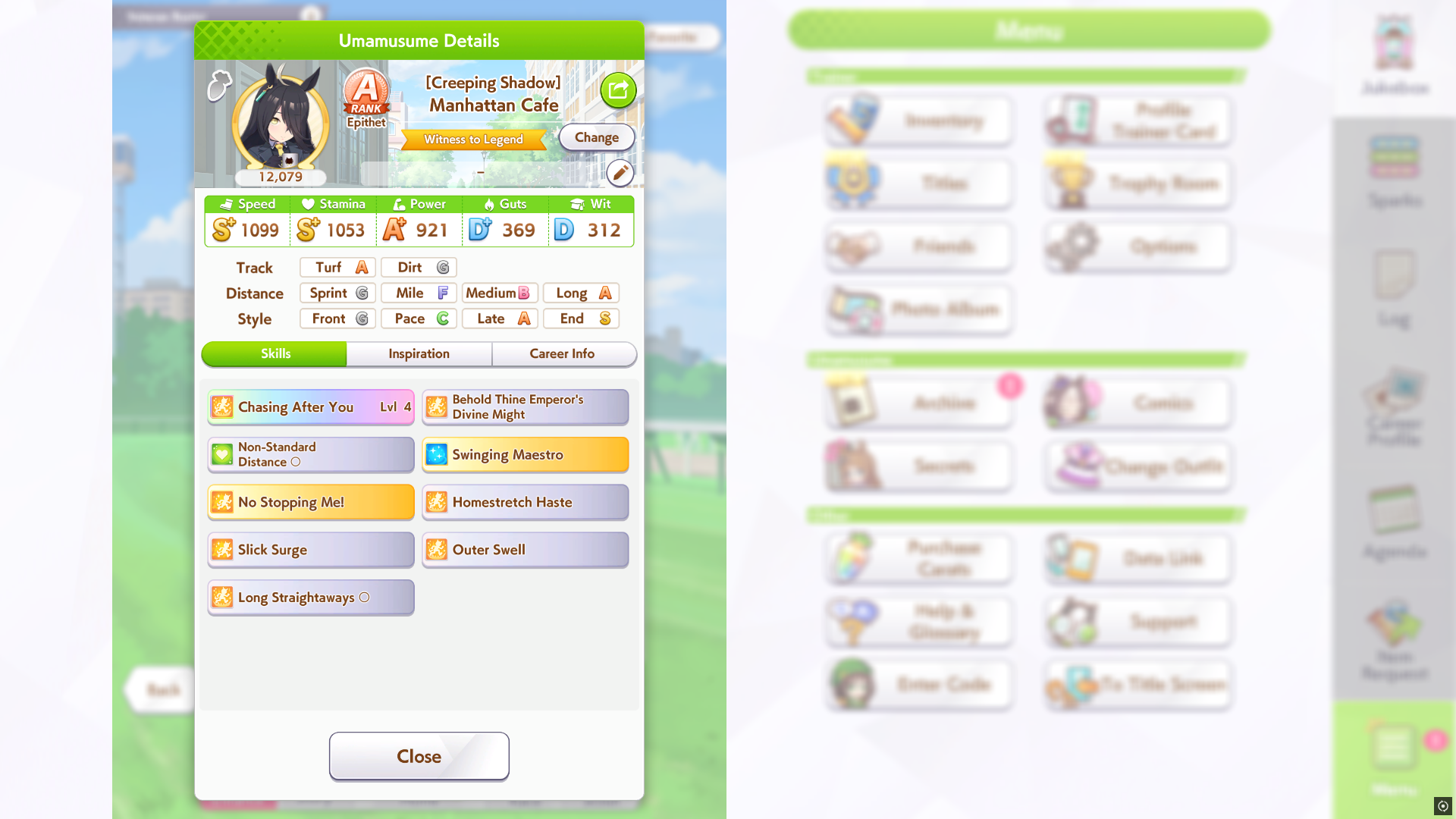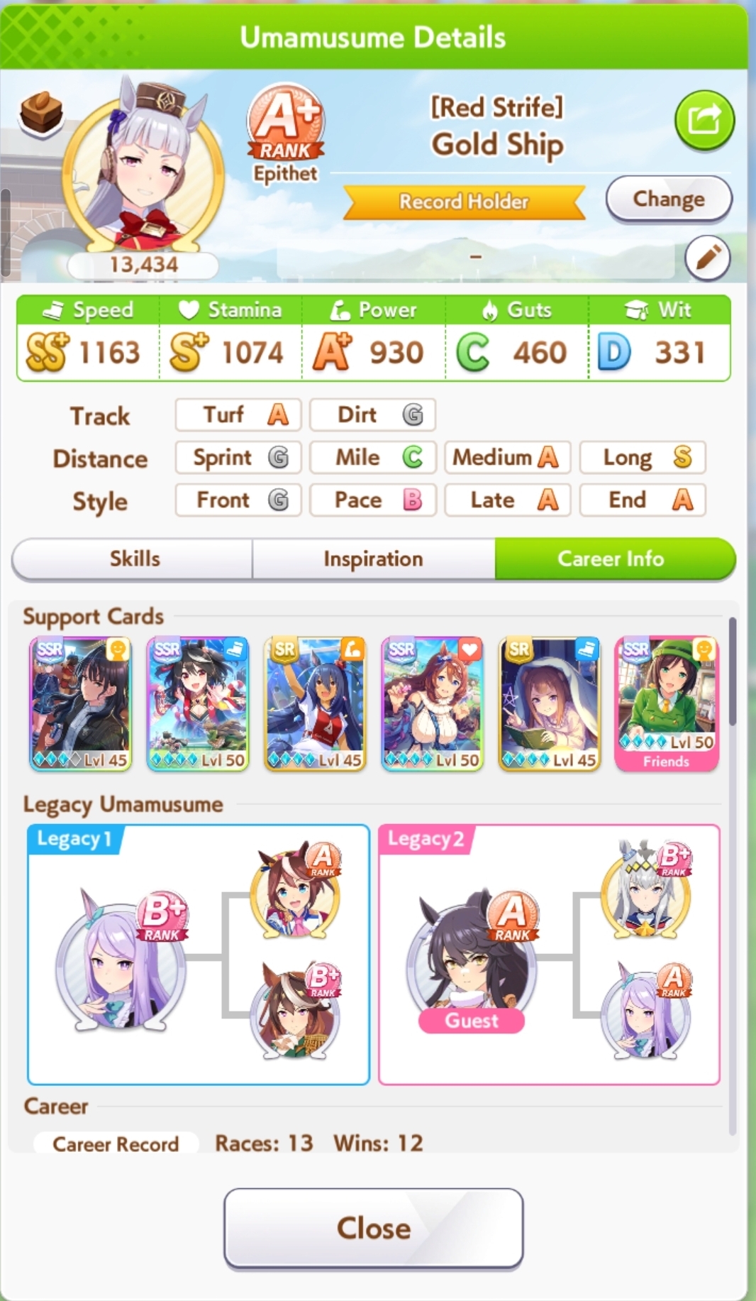 И на последнем месте даже с учетом недавнего бафа - гатс. Если к финишу бегут две +- одинаковые умы, то они борются за место благодаря гатсу, это что-то типо мотивации прибежать первее, на коротких дистанциях оно будет важнее стамины и мб важнее павы, но хз это только недавно ввели