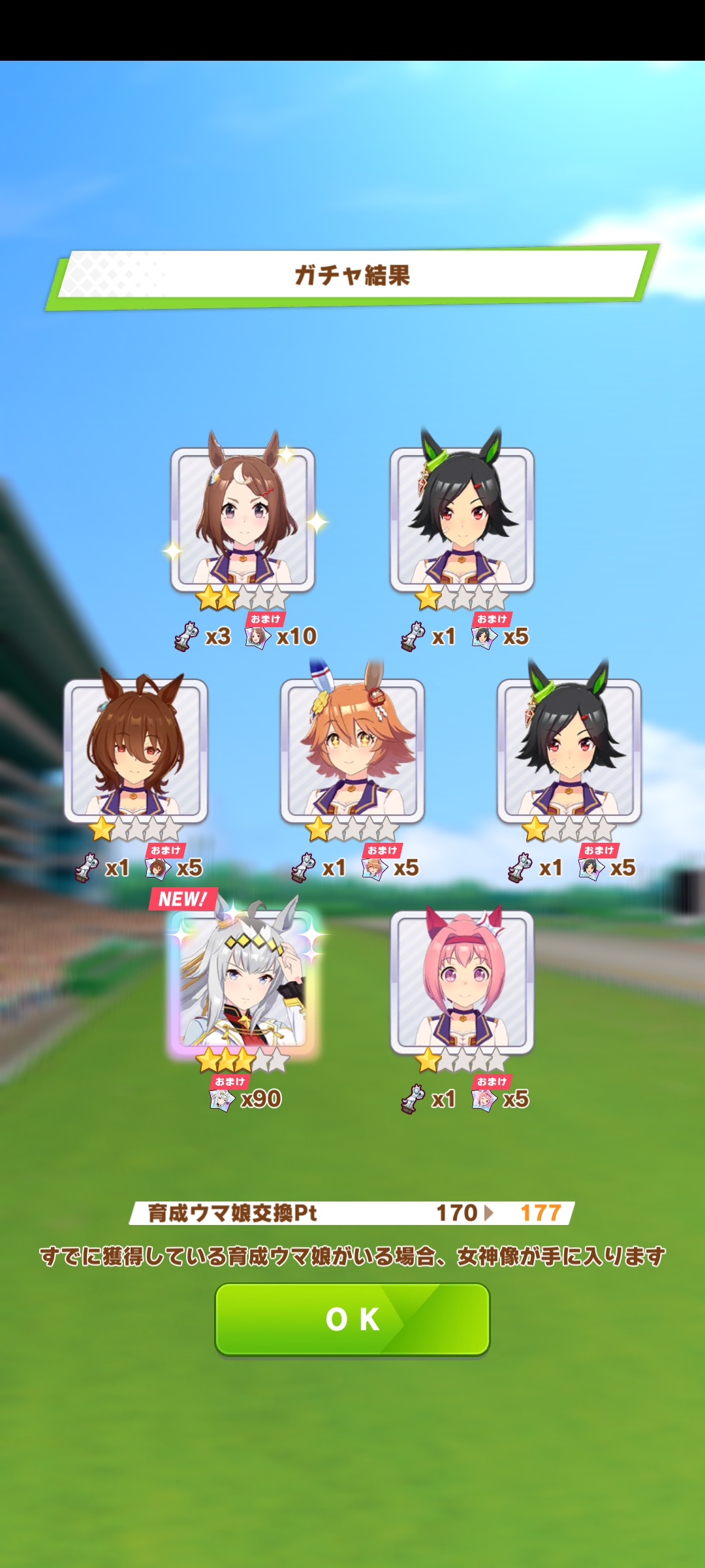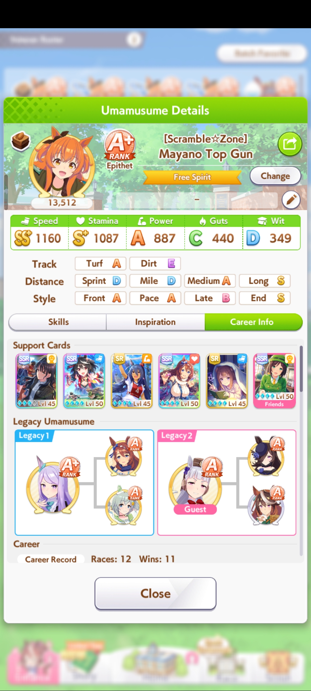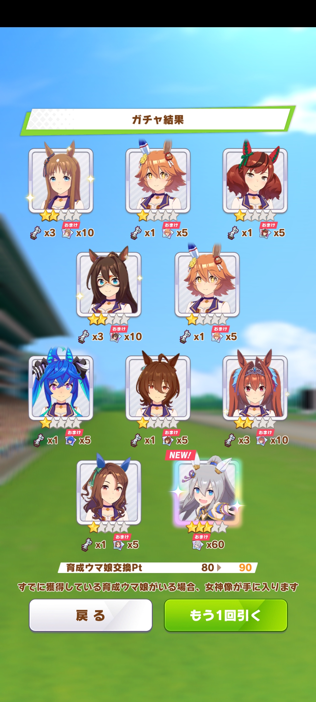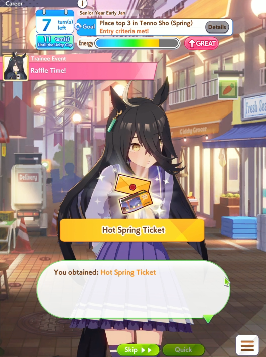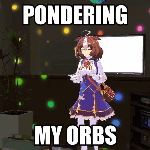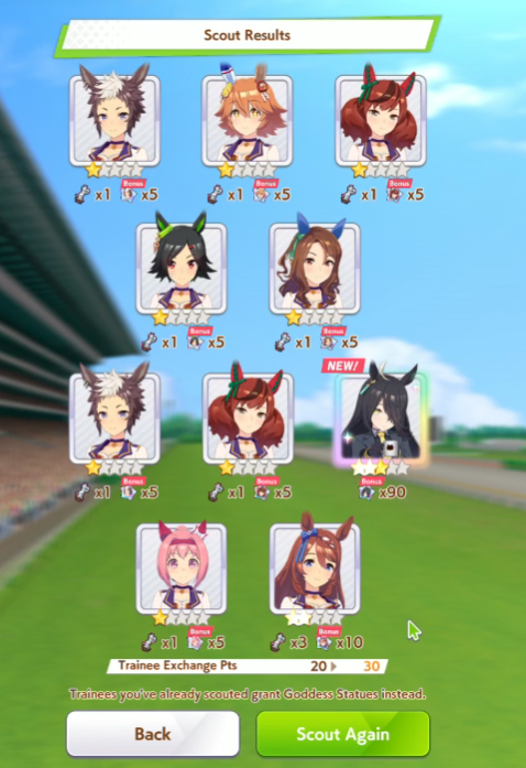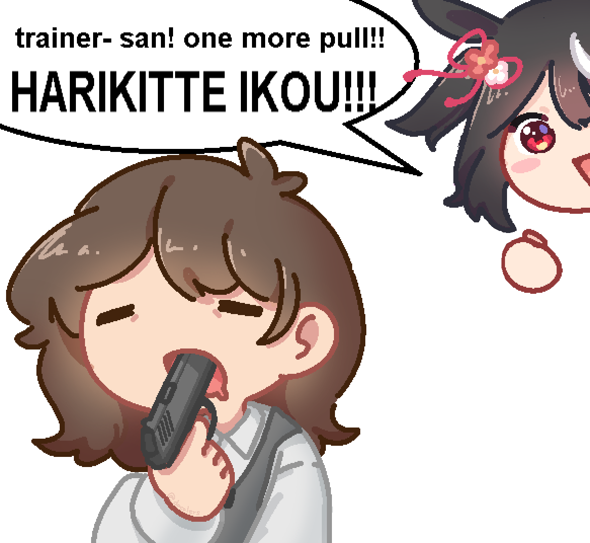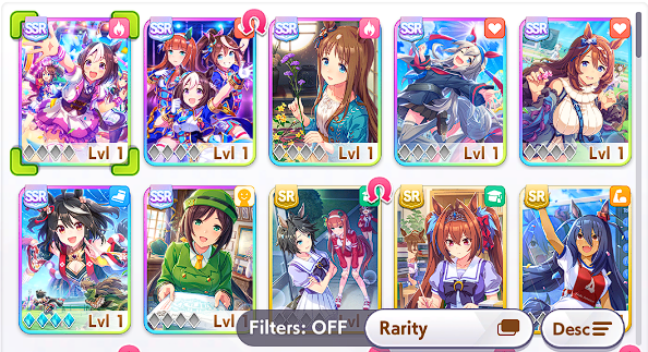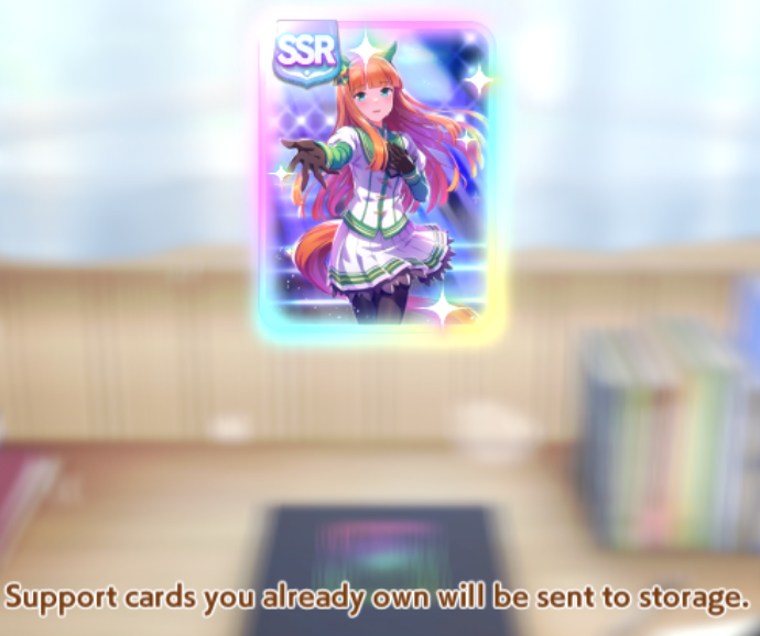 К слову о карточках.Игра хитрая залупа, ты закатываешься с идеей, пойду крутить лошадей, но это первая же ошибка новичка. В игре надо крутить карточки, которые состовляют основу при прокачки лошади в карьере. От них зависит, будешь ли ты с трудом накачивать А рейтинг или Эс, условно, рандом всё равно решает, но тем не менее, колода очень важна. В идеале, ты закатываешься через неделю и крутишь баннер карточки Китасан Блэк, которая имба и накручиваешь её 5 копий. Хотя бы 3. А дальше делаешь что хочешь уже.