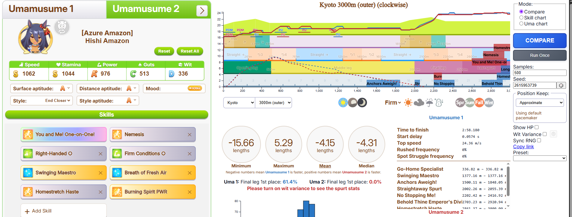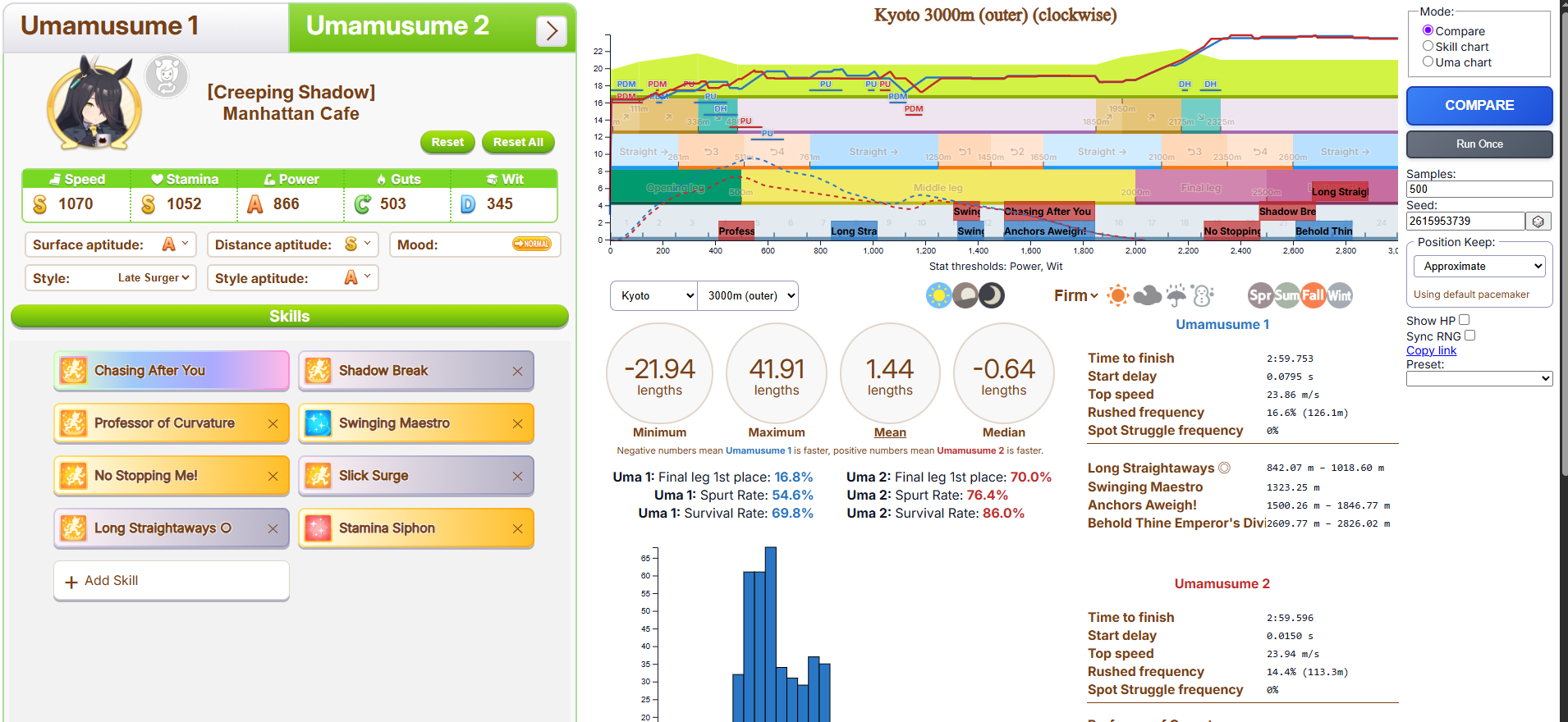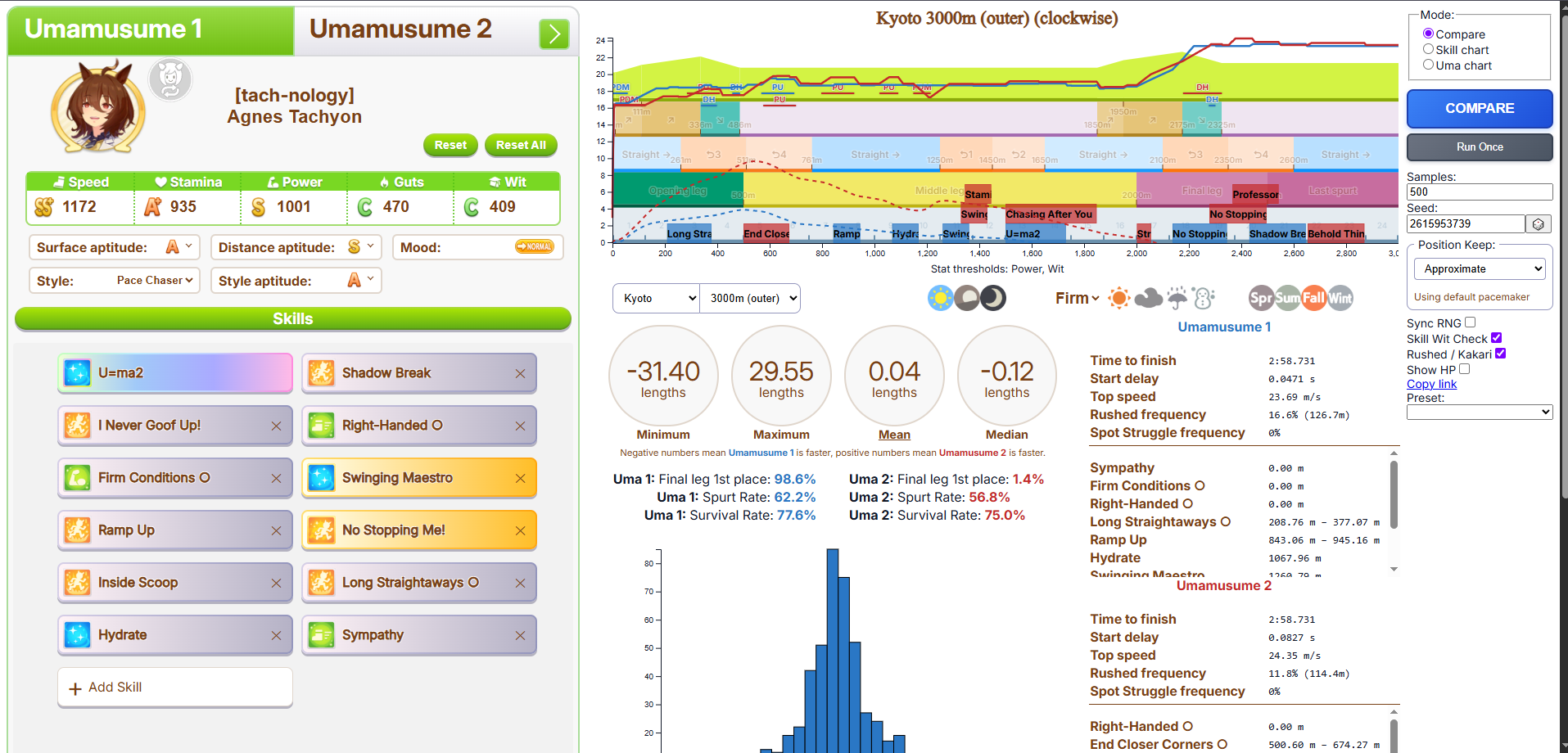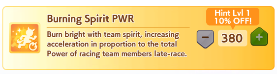 >>6054931 По японскому калькулятору это как примерно +981 стамины. Если сделать 4 скилла на 5.5% (т. е., ульта плюс три жёлтых) и один на 1.5% (т. е., один серый), то уже есть небольшая вероятность добежать до финиша, не выдохнувшись, а с 5 на 5.5% без скиллов на 1.5% уже почти 100% вероятность не выдохнуться. Но это ещё зависит от настроения, я с нейтральным настроением смотрел. У неё там, кстати, ещё могли быть зелёные скиллы на стамину.