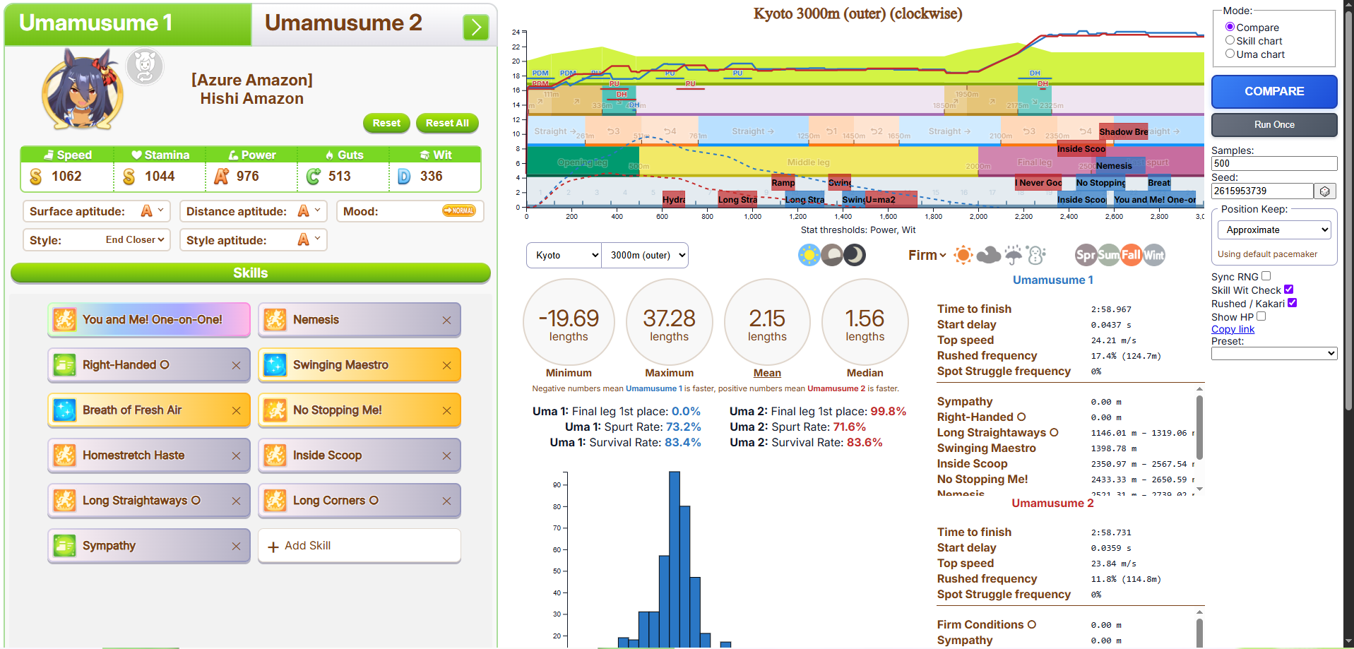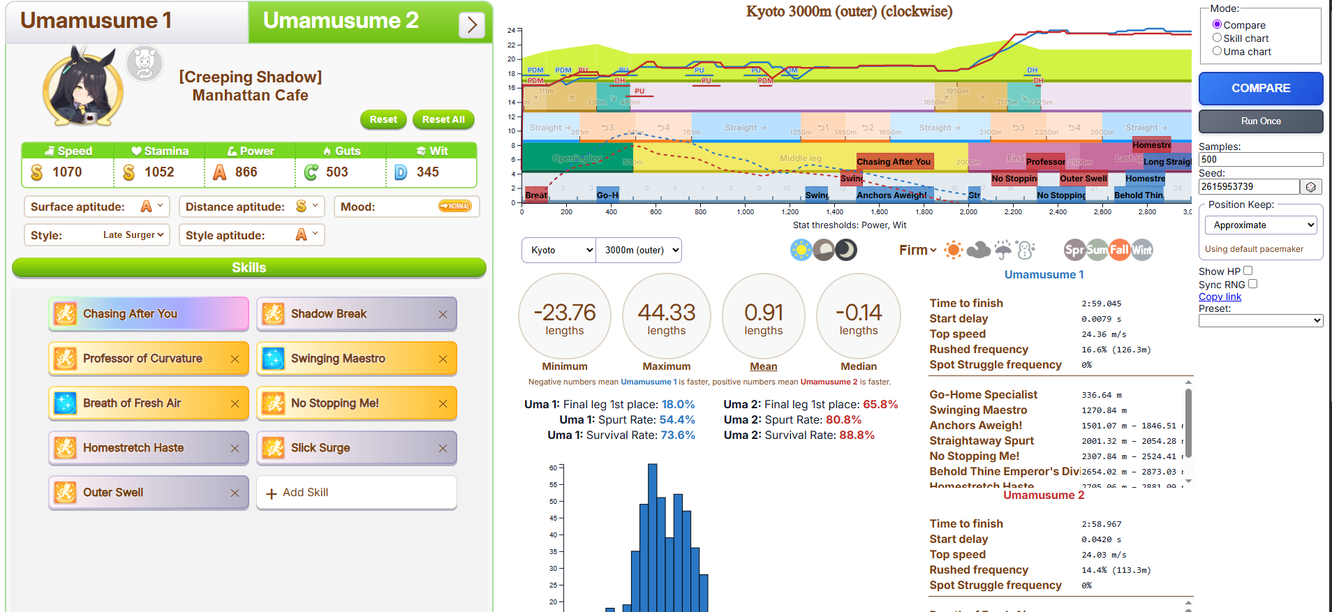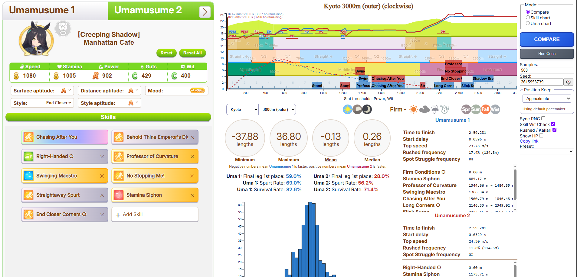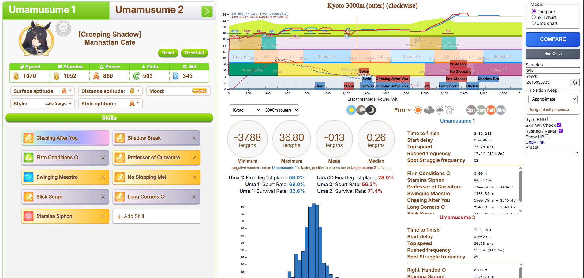 >>6054931 По японскому калькулятору это как примерно +981 стамины. Если сделать 4 скилла на 5.5% (т. е., ульта плюс три жёлтых) и один на 1.5% (т. е., один серый), то уже есть небольшая вероятность добежать до финиша, не выдохнувшись, а с 5 на 5.5% без скиллов на 1.5% уже почти 100% вероятность не выдохнуться. Но это ещё зависит от настроения, я с нейтральным настроением смотрел. У неё там, кстати, ещё могли быть зелёные скиллы на стамину.