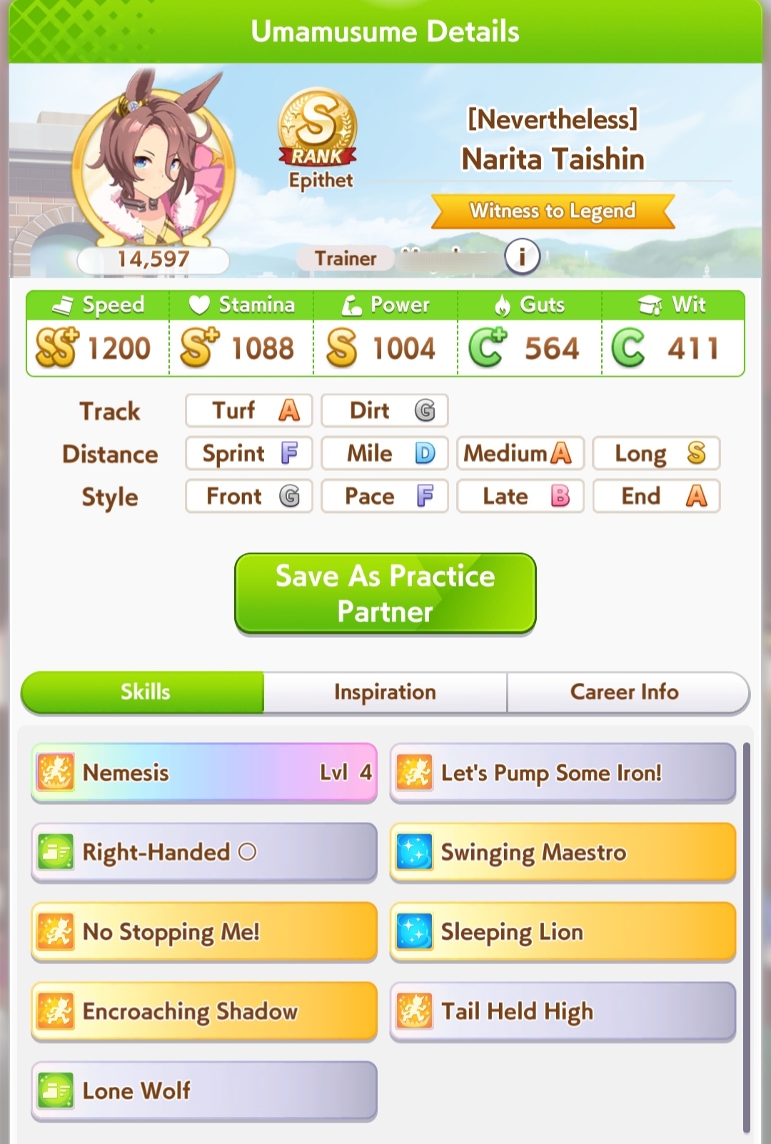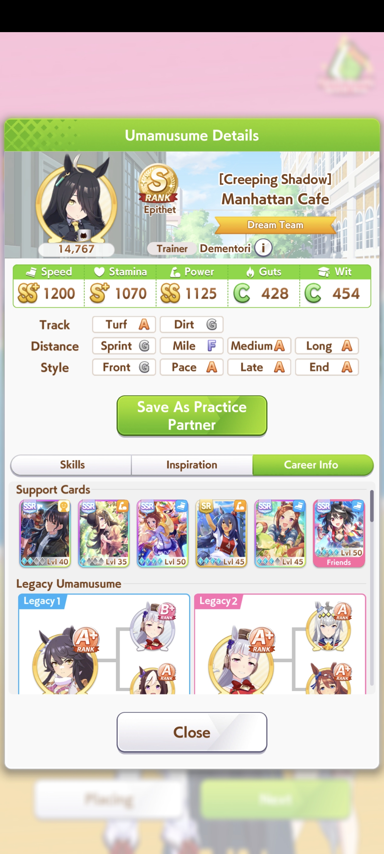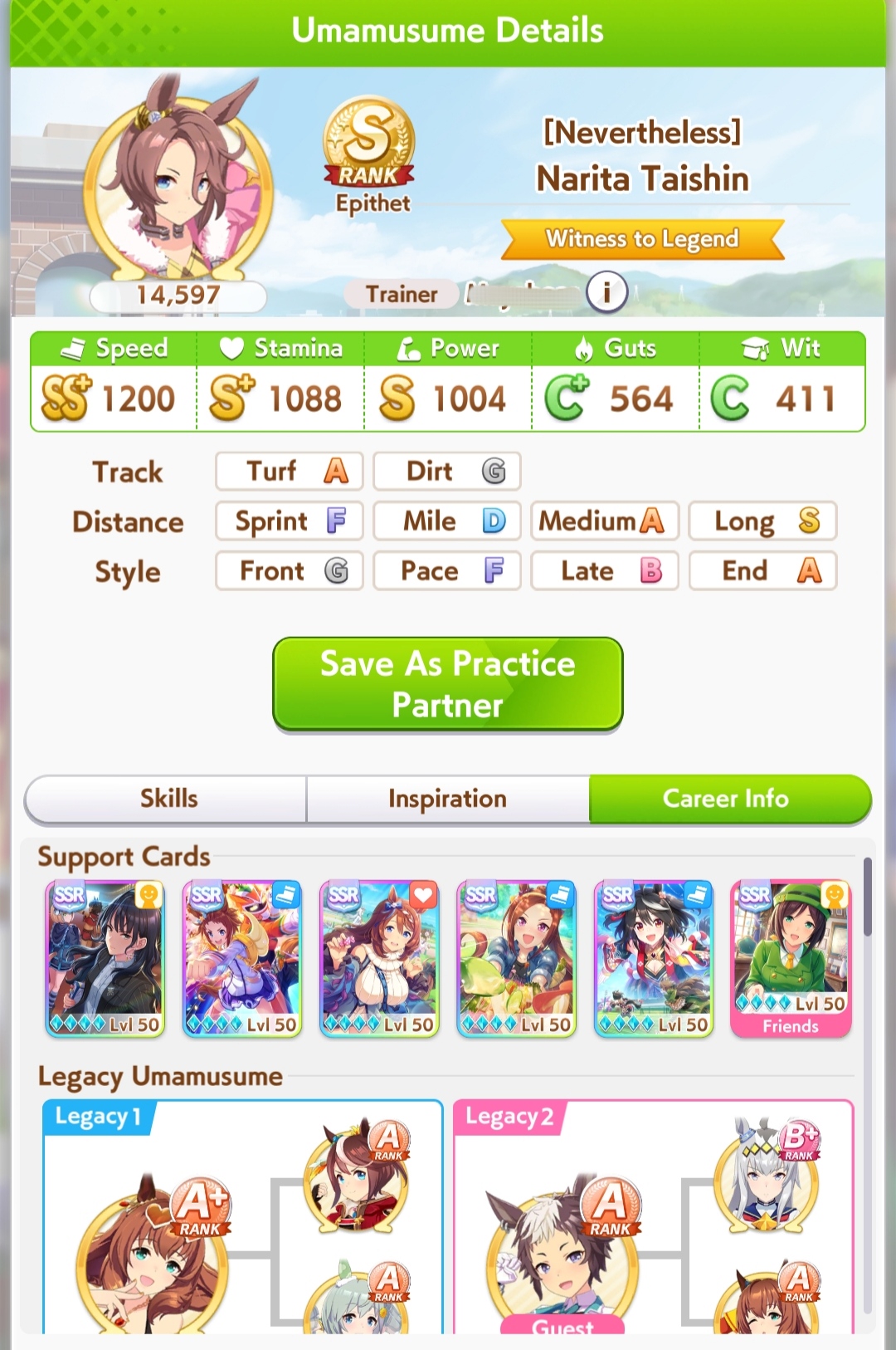 Голшип опять тренироваться не хочет. Два забега - в первом пробила 1000 стамины при 800 спида, во втором - 1100 спида при 780 стамины. 3 спд/2 стм/1 инт сборка, все что мог ей сделал. Походу сосну в турике, ибо у меня две из трех лошадей это лейтеры с 1000-1100 спида. Зато эти каловые голшипы как родители внезапно хороши. Вообще чаще родителей фармлю с нового режима чем с ура финала