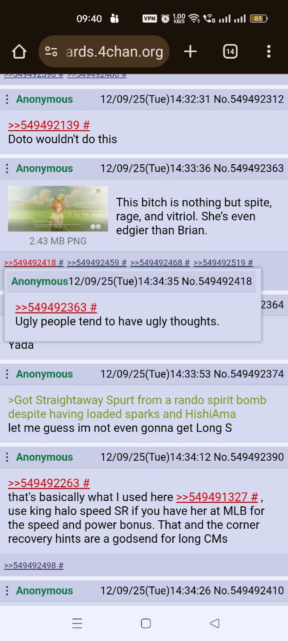>>6054154 >все настолько увлеклись энд клозерами, что даже кого-то на фронт не ставят Так потому и увлеклись что они побеждают в 80-90% процентов случаев. Для той же маквин пройти все проверки и стать фронтом куда менее вероятно чем для эндклозера прокнуть но стопинг. Вот и весь секрет. Так то да качаешь топ статы 1200-1200 и ты победишь если не лэйт, базара нет. Но другое дело попробуй их накать. Даже для обладателей топовых колод это не легко, а остальные и вовсе мучаются, даже А+ и С-ки и то видно что кривые и компромисные, пока прямо идеальных статов еще ни у кого не видел на этом турнире. Мне чисто повезло что была голши с С-кой на дистанции и сравнительно нормальными статами 1000+800 спид-павер и достаточной стаминой что бы добежать, она хоть что-то побеждает, два из пяти мои чаще всего, но больше нет никак.