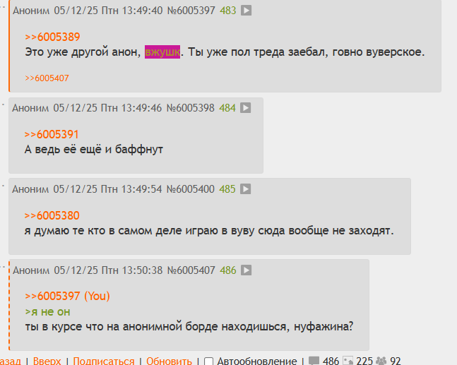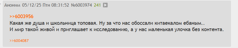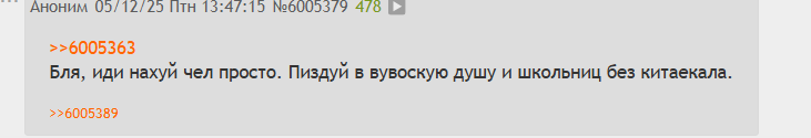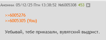 >>6005734 А, проблемы не только с логикой, но и с памятью, ну или с внимательностью. Перепост от 28.11.25 Выучи уже, наконец, ответы на свои же вопросы и перестань позориться. На первый раз прощаю. Дальше паста: Эй, Юшка блять, я здесь. Не веришь? Картинку с самураем видишь? То-то же. Ну что, даже сегодняшние аргументы не отличаются от предыдущих. Кроме жалких оскорблений, ужимок и попыток задеть меня как можно более громким смехом, ничего не было. Я не искал и не ищу здесь внимания лично к себе, но к проблеме, которая была обозначена. И если на эту проблему никто не обратит внимания, мне будет похер. Это процесс. Оставление этого поста без ответа я буду считать капитуляцией.
