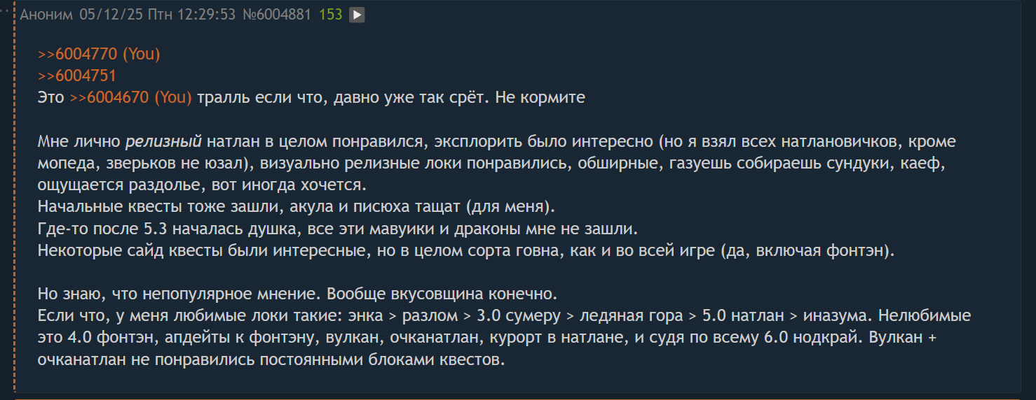 Но знаю, что непопулярное мнение. Вообще вкусовщина конечно. Если что, у меня любимые локи такие: энка > разлом > 3.0 сумеру > ледяная гора > 5.0 натлан > иназума. Нелюбимые это 4.0 фонтэн, апдейты к фонтэну, вулкан, очканатлан, курорт в натлане, и судя по всему 6.0 нодкрай. Вулкан + очканатлан не понравились постоянными блоками квестов.