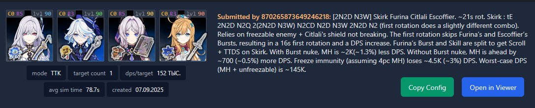 >>6008582 А мне кажется таблички близки к правде. Вот тут чисто урон скирк 7,3кк за 79 секунд. Это где-то 92к дпс чисто на ней. А там еще фурина и эскофье дотянут где-нибудь до 120к, какой и рисовали протыки.