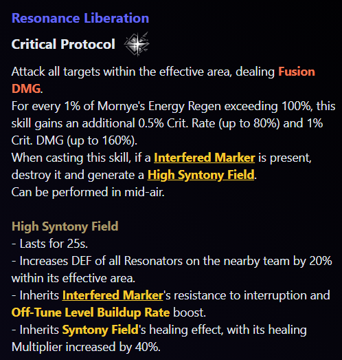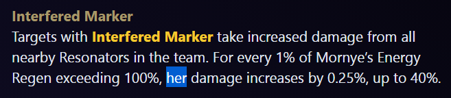 Судя по всему, в английском не только с аутро Морни ошиблись при переводе, но и с форте. Английский вариант: Interfered Marker Targets with Interfered Marker take increased damage from all nearby Resonators in the team. For every 1% of Mornye’s Energy Regen exceeding 100%, HER damage increases by 0.25%, up to 40%.