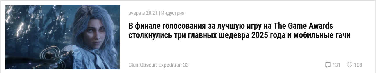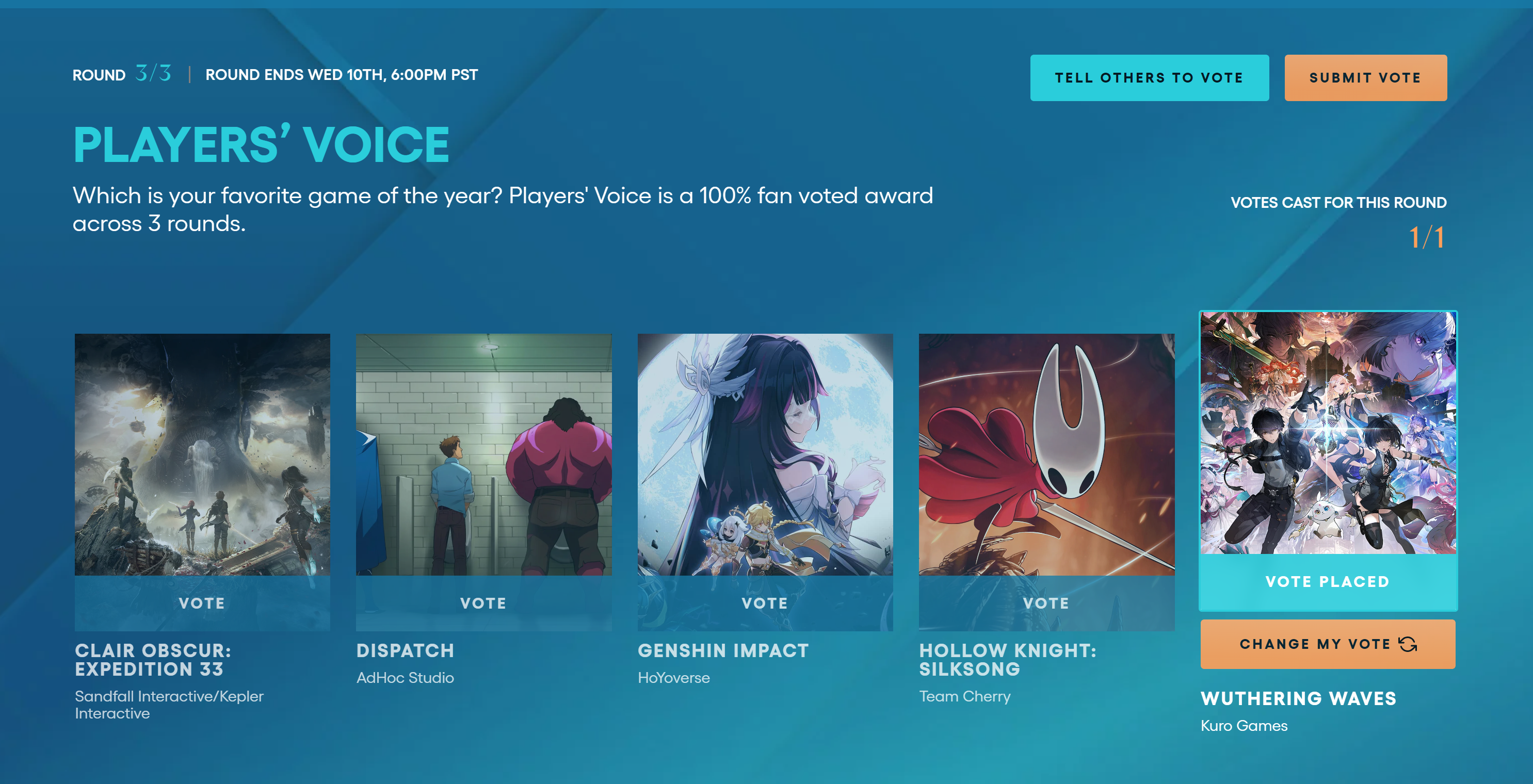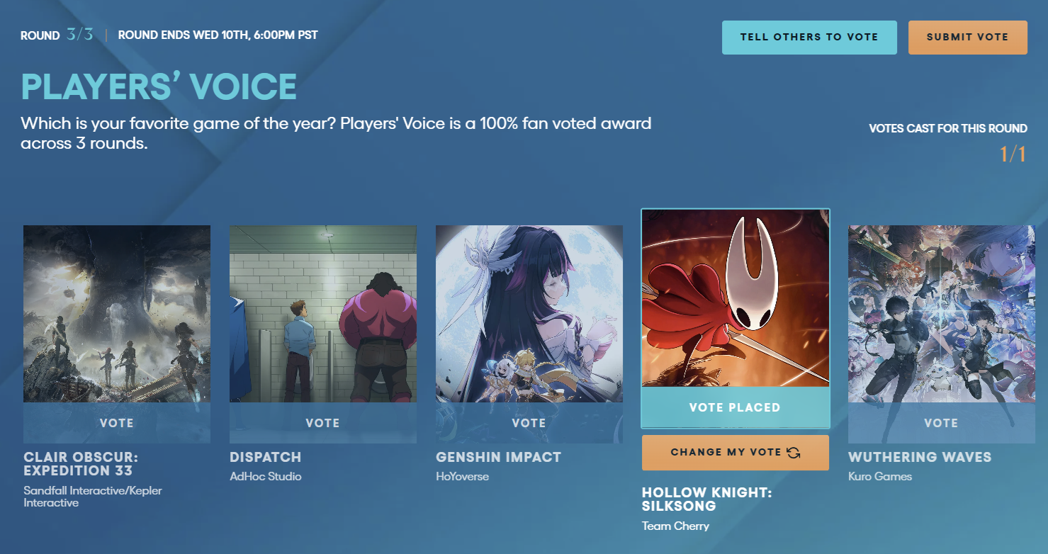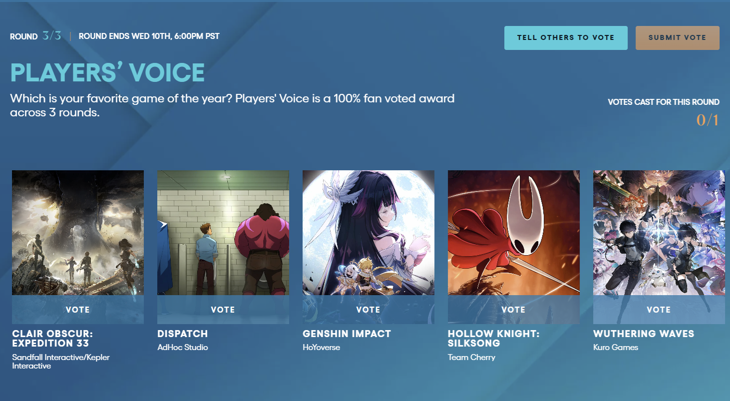 >>6023750 блин это по сути все игры за которые я отдавал голос раньше, кроме геншина к сожалению скорее всего клер обскур победуит,я бы казал даже без вариантов а вот чему я буду удивлен так это победе геншина - это говнище в этом году просто пиздец как много хуев от аудитории приняло