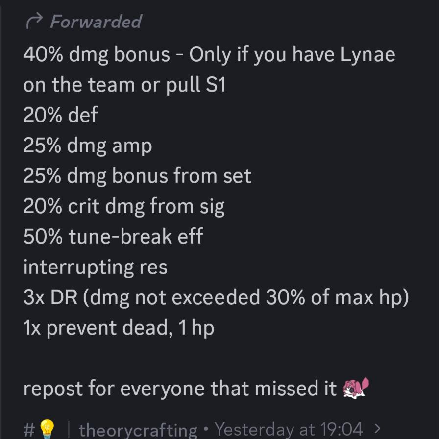 >Что считается норм эхо, когда крит рейт хороший ролл + крит дмг хороший ролл + ещё что-то полезное? Даблкрит(любой) плюс 1 полезный стат (если хай роллы в кш и ку - то хватит и просто даблкрита). Для персонажей играющих от ульты(картефия, Карлотта, Чанли, Джиян, Зани и пр.) - это энергореген, для персонажей играющих от другого - Атк% либо ДМГ% - зависящий от того типа урона которым домажит персонаж.