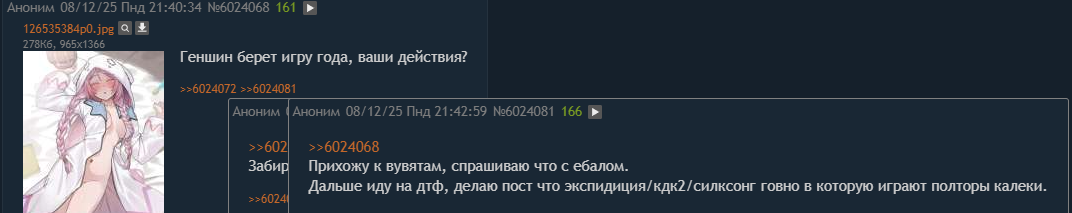 >реддит тред в вува сабе про гейм авордс >куча комментов про то что нам надо побить геншин, геншин кал Хуя, я думал это только этот тред такая помойка. Игра попала в топ 5, нет чтобы порадоваться. Нееет, основные мысли опять про геншин. Точь в точь шизы итт, чуть что на каждую новость о вуве начинают "а вот в геншине...". Реально вувакоммьюнити ебнутое с токсик позитивити, надо мне просто играть в игру и не читать никаких постов нигде.