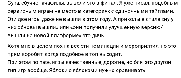 >>6023782 >Так что в это номинации победит либо гашня либо вува, тут уж кто сплоченней и мотивированней. Ты сильно переоцениваешь кол-во фанатов Вувы и Гашни, по крайней мере тех, что реально считают их своей игрой года. Набегут, разве что просто чтобы другой проект случайно не вышел победителем. Я в Вуву с удовольствием играю уже почти год, но назвать ее игрой года язык не повернется. У гач есть масса ограничений навязанных жанром, и часть из них убивают любые шансы претендовать на что-то серьезное в плане геймплея или сюжета. Вува обязана в каждом патче оставлять нас 1-на-1 с новейшим баннером на пару часов, что просто смешно для игры с десятками персонажей.