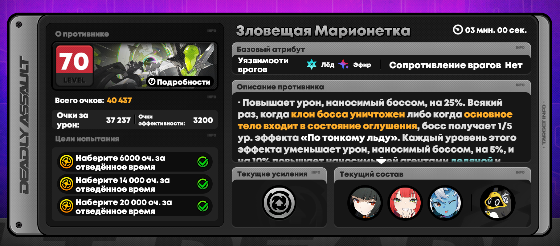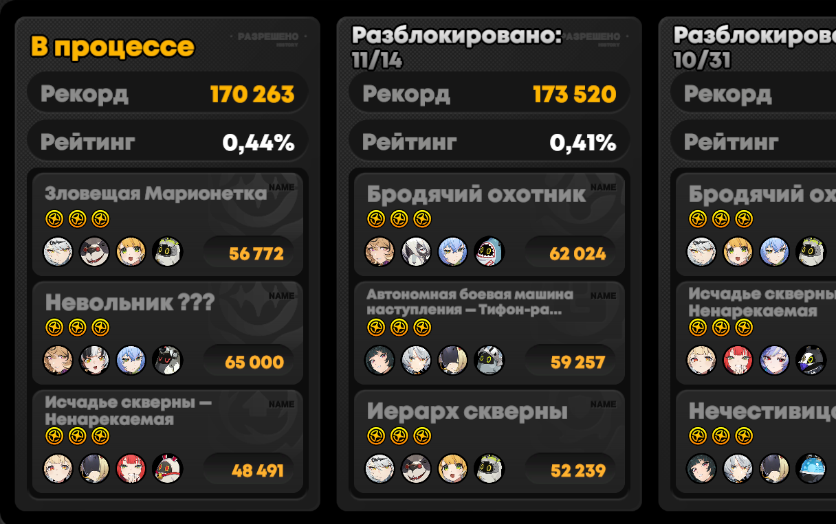 >что ты готов брикнуть себе акк Не было акулы, циньи, джуань, мыши, лайтера, бернис, янаги, энби0, гашетки, хьюго, фу-фу, элис, сид, орфеи. И вроде как аккаунт не брикнулся. Все закрывал, все оборонки на 7s, пару ресетов штурма на 6 шаров делал, потом с исюанью получилось нормальные 3 отряда иметь и закрывать на 9 шаров.