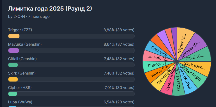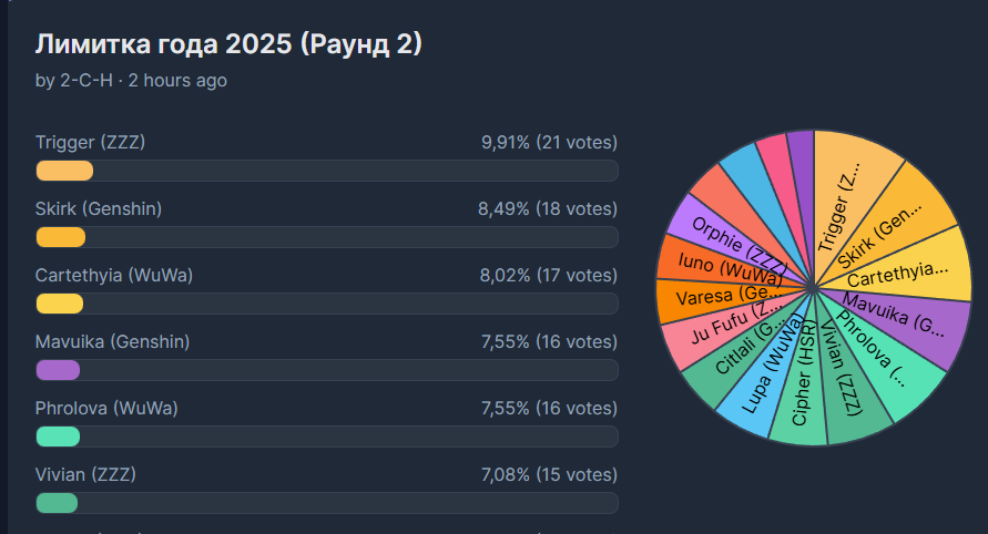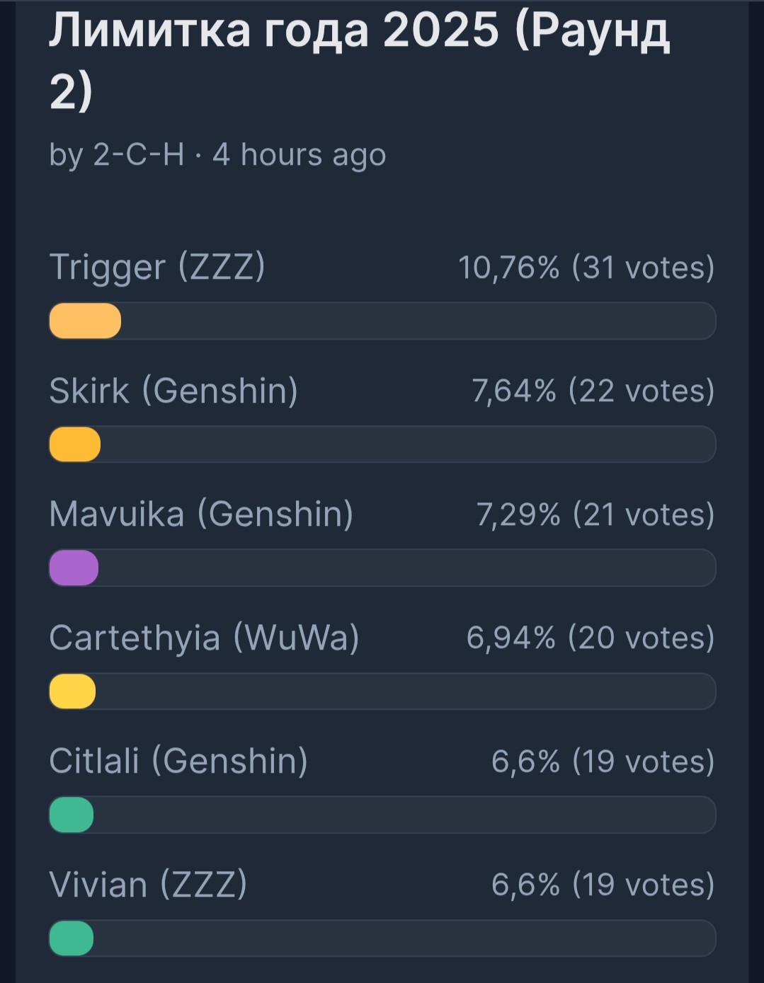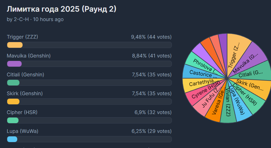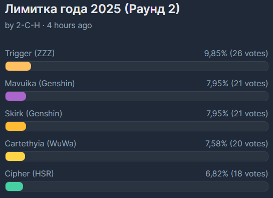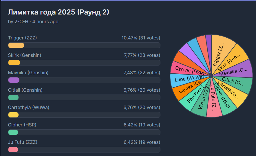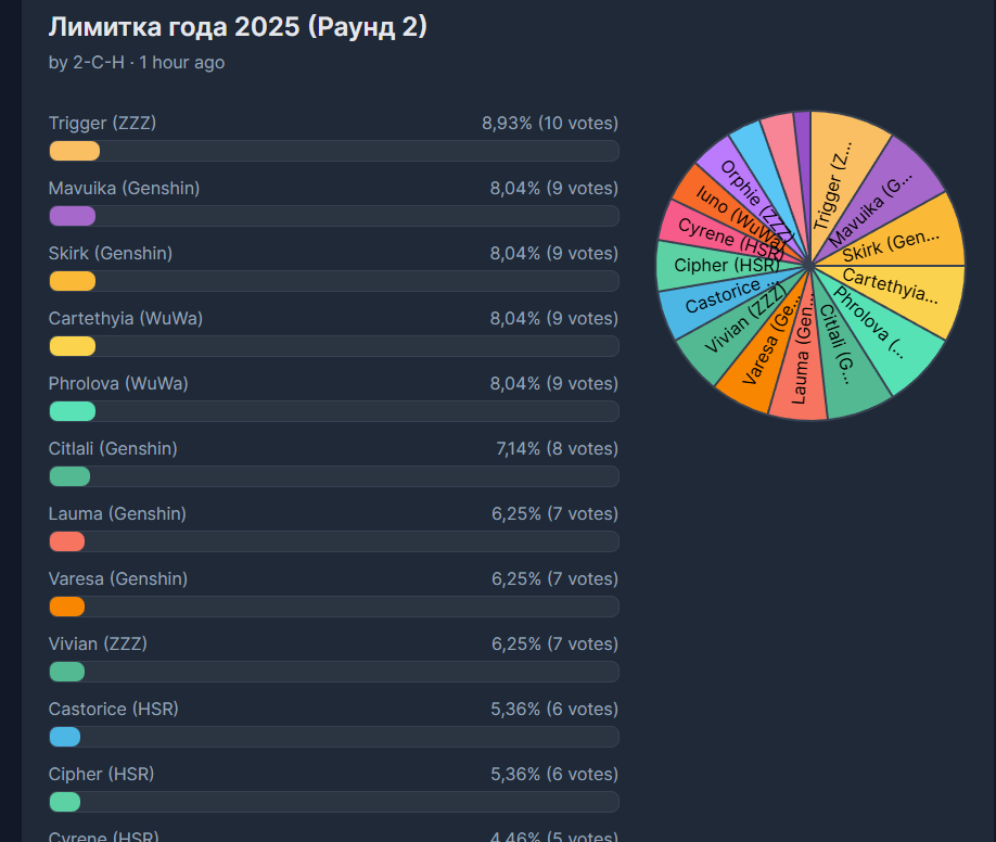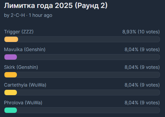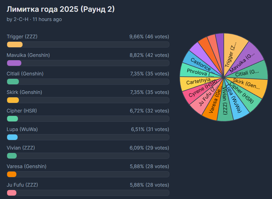 В этот раз участвуют четверо из каждой игры, набравшие больше всего голосов в первом раунде. Кроме Геншина, здесь 5 участников из-за одинакового результата на 4 месте у Лаумы и Варесы. Желательно (но не обязательно) отдать по 1 голосу на каждую игру т.к. в финальной битве останется по 1 персонажу из каждой игры.