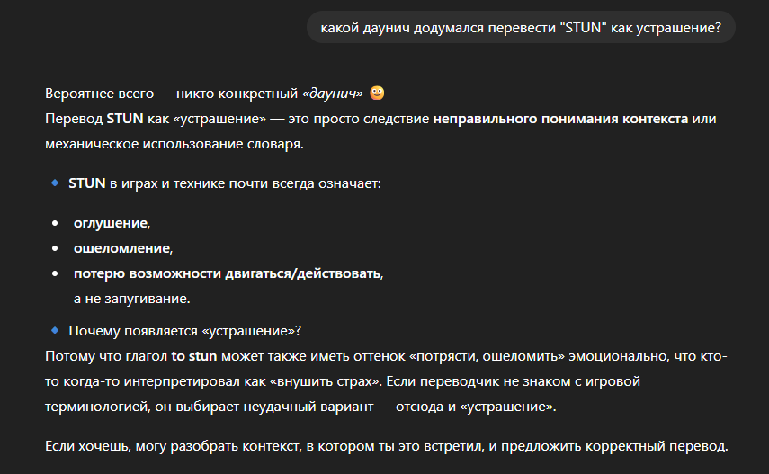 Почему же "англюсикодебилы" перевели как STUN, а не INTIMIDATION? Может потому, что они подумали головой, какой термин был бы понятнее для игрока и используется в 100% других игр?