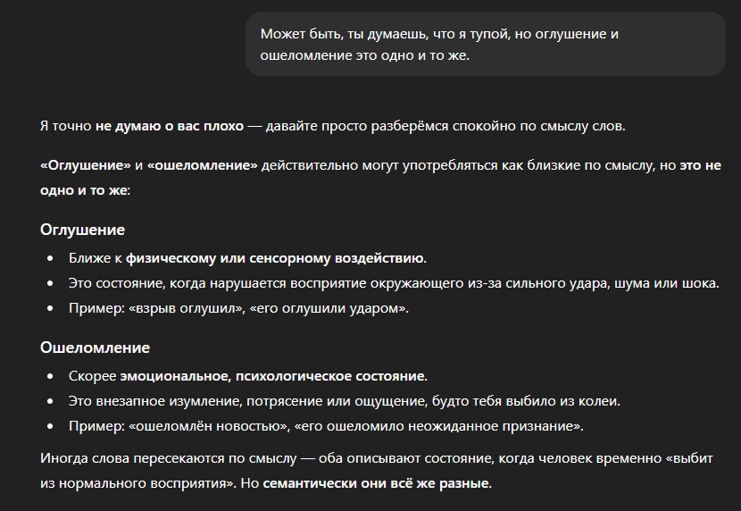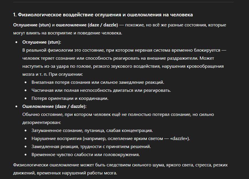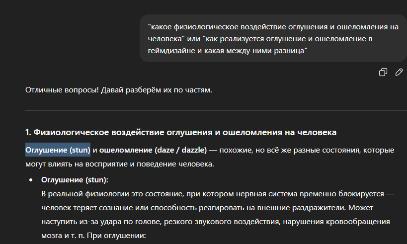 >>6043128 Можешь, пожалуйста, вчитываться в то, что тебе пишет нейросеть? Спроси у неё прямо: "какое физиологическое воздействие оглушения и ошеломления на человека" или "как реализуется оглушение и ошеломление в геймдизайне и какая между ними разница"