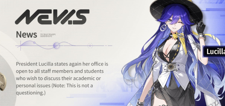 ★ Линея Мистер S.I.G.M.A. (Signal Intelligent Guidance & Management Automation) опубликовал в этом месяце уведомление о правилах дорожного движения: из-за неоднократных их нарушений студентке второго курса Подготовительной программы Линее запрещено проводить какие-либо модификации транспортного средства. ★ Морни Новая Солнечная Церемония выходит на завершающую стадию. Команда профессора Морни завершила первые пусковые учения. ★ Луцилла Президент Луцилла ещё раз заявляет, что её офис открыт для всех сотрудников, желающих обсудить свои академические или личные проблемы (Прим.: это был не вопрос) ★ Сигрика Многообещающая кандидатка Гелиодической шестерки объявила об очередном открытии в наблюдении за птицами: редком чисто-белом виде птиц в Академии Старторч?! ★ Люк Херссен В ReNU открыто новое отделение психического здоровья. Объявление доктора Люка Херссена в связи с этим: лазарет открыт для всех, кому нужна помощь с физическим или ментальным здоровьем.