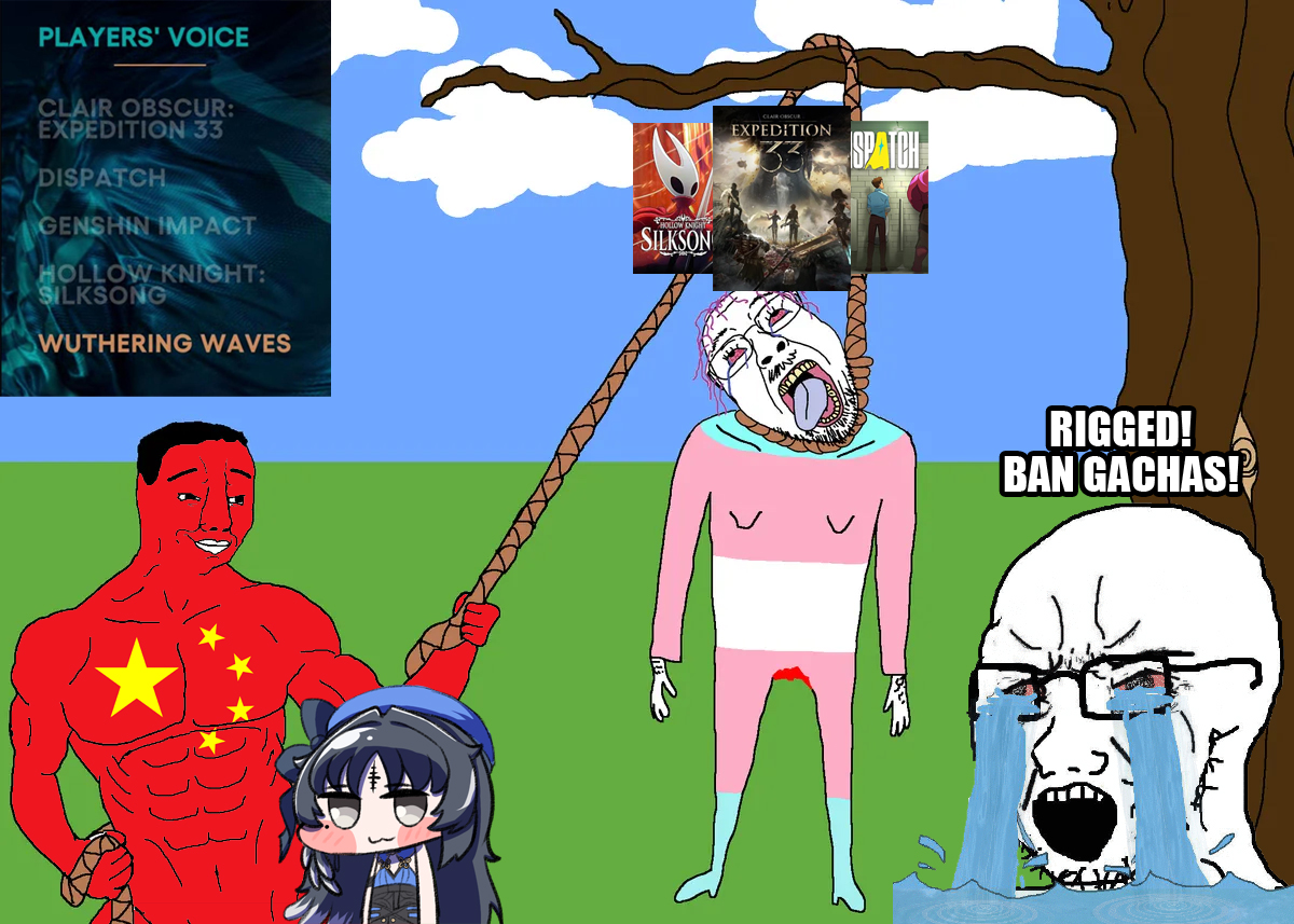 Поспрашивал задротов и разобрался. Слышали же про Hoyoverse? Ну у которых Genshin как денежный принтер. Угадайте-ка, Wuthering Waves это ещё один проект Hoyoverse. Игра выглядит как геншин, играется как геншин, обе гачи. Они придумали подставную контору Kuro Games по аналогии со своим вторичным офисом Cognosphere, чтобы избежать антимонопольных законов. Вот и постыдный результат. Обокрали нормальные игры, как обычно. Как только шёл новый раунд, В-С-Ё, тысячи лишних голосов за WW. Нет, простите, но лишь у одной студии есть такая армия ботов из игроков в геншин.