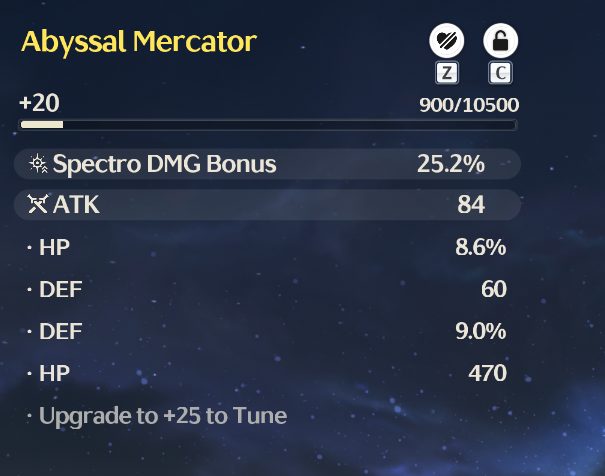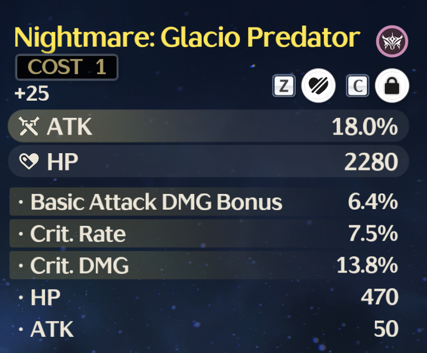 Пульсовый соратник: Атака увеличена на 12%. После нанесения урона врагу в состоянии [Вмешательство гармонии], бонус к урону от базовой атаки увеличивается на 6% в течение 3 секунд, суммируясь до 4 раз. Срабатывает раз в 0,5 секунды. Повторные срабатывания обновляют длительность. Звезда Бозе: Атака увеличена на 12%. После того, как персонаж в группе использует [Навык Разрушения Гармонии], его собственный бонус к атаке и урону от базовой атаки увеличивается на 12% в течение 14 секунд.