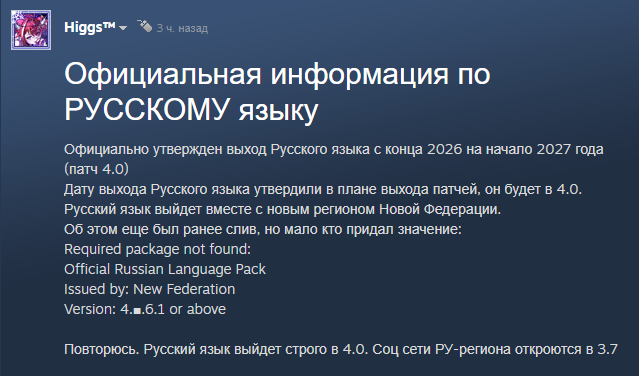 Да пока Писевор к 4.0 разродится русиком, это уже будет неактуально. Перевод идеально было к 3.0 выпустит, чтобы перекрыть новые релизы или к коллабу на хайпе.