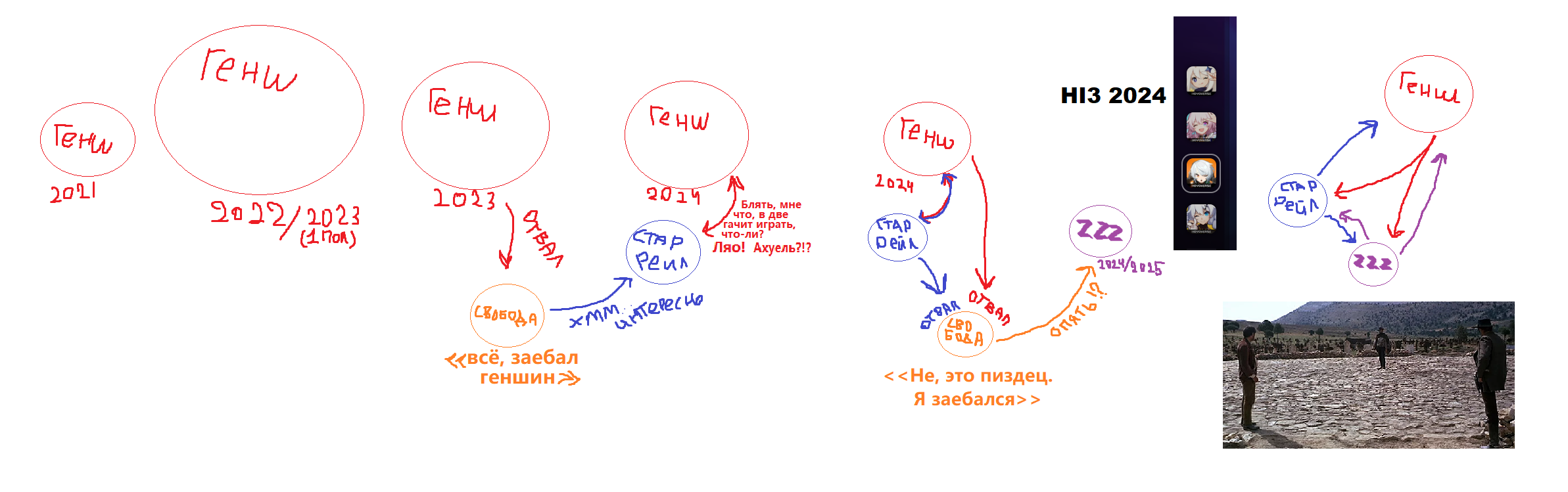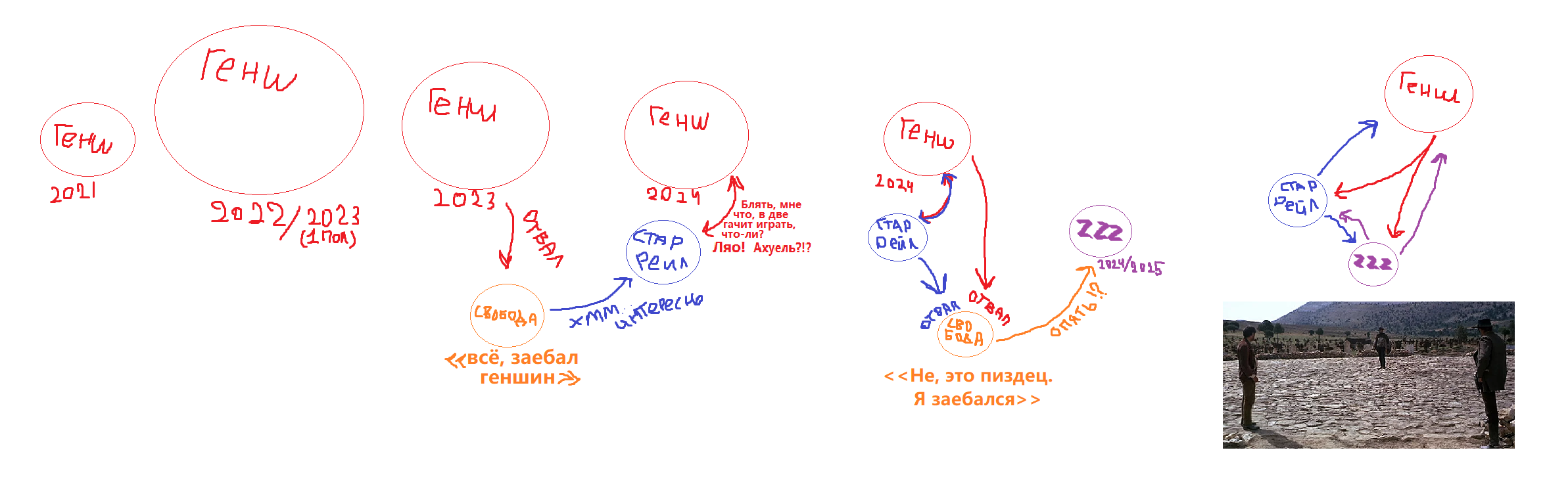 Вот смотри, у нас есть самый страт Геншина, который по разным обстоятельствам, но произвёл фурор. Сразу же огромный поток игроков. Дальше - больше, аудитория всё только расширялась и в какой-то момент достигла своих пределов. Всё, расти дальше некуда, все заинтересованные уже привлечены. Но тут сталкивается проект с другой проблемой, а именно уставание. Делаем поправку ещё и на то, что это гача, что добавляет дополнительные трудности к существованию... В общем какая-то аудитория, которая уже попробовала Геншин и ушла, или просто ознакомилась с Геншином и не заинтересовалась - есть. У самого же Геншина уже лимит по расширению ЦА. И тут единственно верное решение, сделать ещё один проект, который будет не похож на Геншин, чтобы переманить тех, кто отвалился и тех, кто про Геншин узнал, но не заинтересован. И вот такой проект появляется и забирает в себя ту часть отвала, также им ещё и часть активных игроков Генша интересуется.