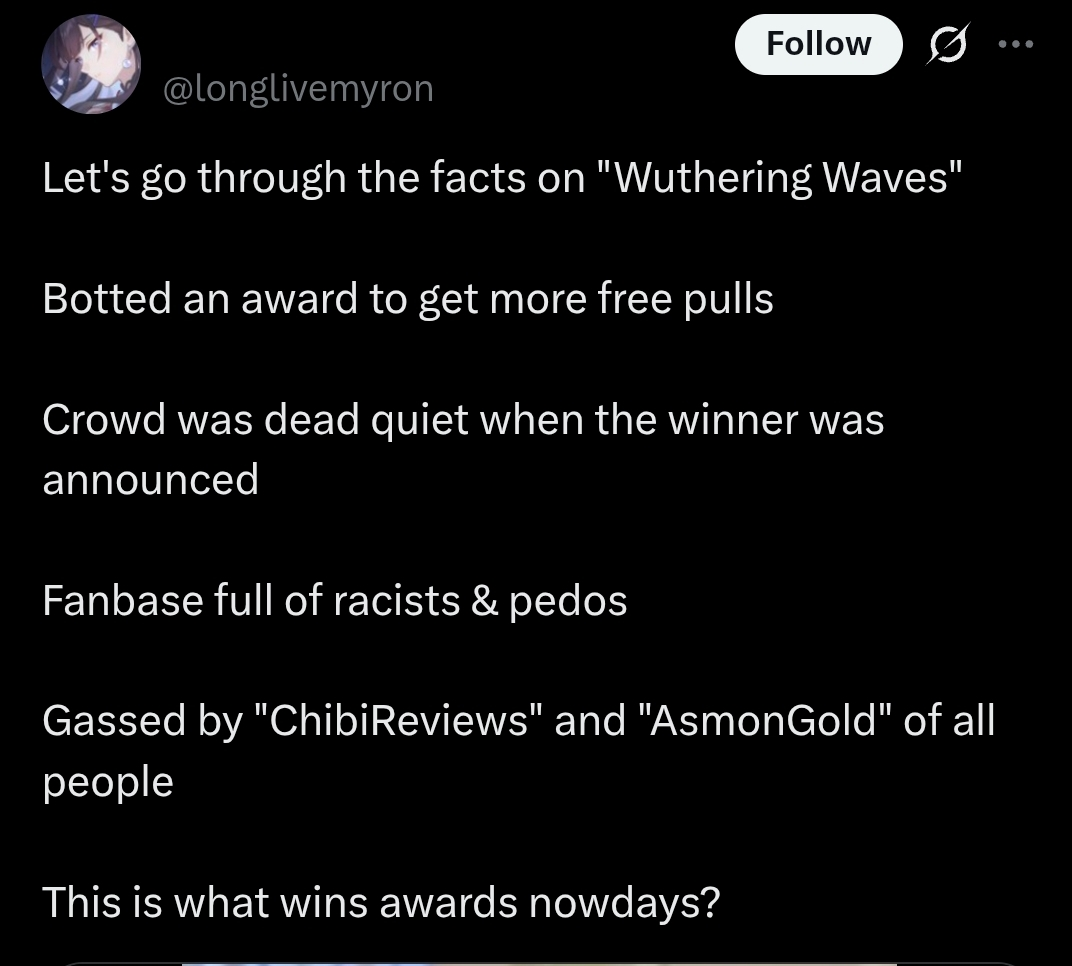 >>6047327 Учитывая, как Ляо аудитории хуем по губам водил за "зрительские награды" в прошлых годах - вообще странно, что Геншин номинацию получил. Кто вообще настолько чмо без самоуважения, чтоб на Ляо бесплатно горбатиться?