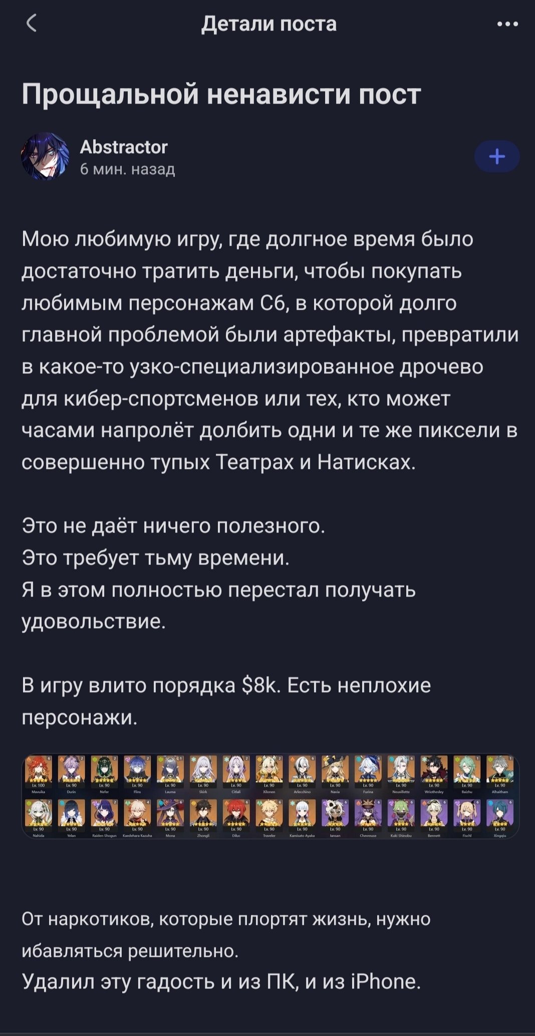 В последнее время реально ляодрочильни дропать охота, все чаще накатывает. Если бы была возможность поставить на паузу и забить то круто, но нет, так нельзя, надо проходить сюжетку, ивенты, задания, надриски с театрами. Честно говоря заебало. Не хочется уже траить все даже тогда когда уверен, что можно лучше.