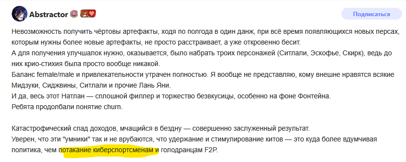 >>6050188 Я покупал подписку и я хотел бы нормальный Натлан и следом Снежную в 6.0 А меня обманули за мои же деньги, хотя я поддерживал любимый проект. Я плачу, а мне в лицо пять лет совали диалоги про то, как покушола и покакола паймона Когда настало время релизить Снежную, мы оказывается что-то недопоняли, будто это моя вина.