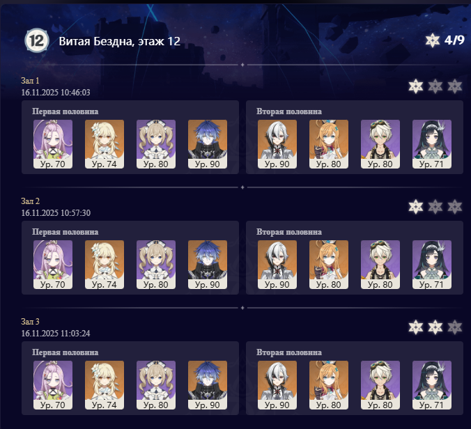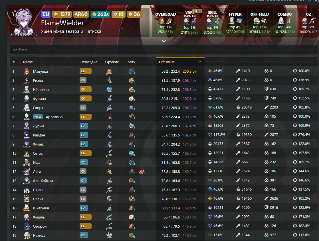 Каким же калом я прошел театр. По сути 2 более менее актуальных дд на аккаунте Арле и Венти и один метовый саппорт в виде Дурина, спиздил из френдлиста Муалани с0 без сигны, очень засейвило прохождение. Но рестартил я раз 10, где-то 4 часа игры заняло. Бтв из 30 чемпиков не одето 12, куча мусора с 1 лвл талантов и 70 лвл просто чтобы попасть в театр.