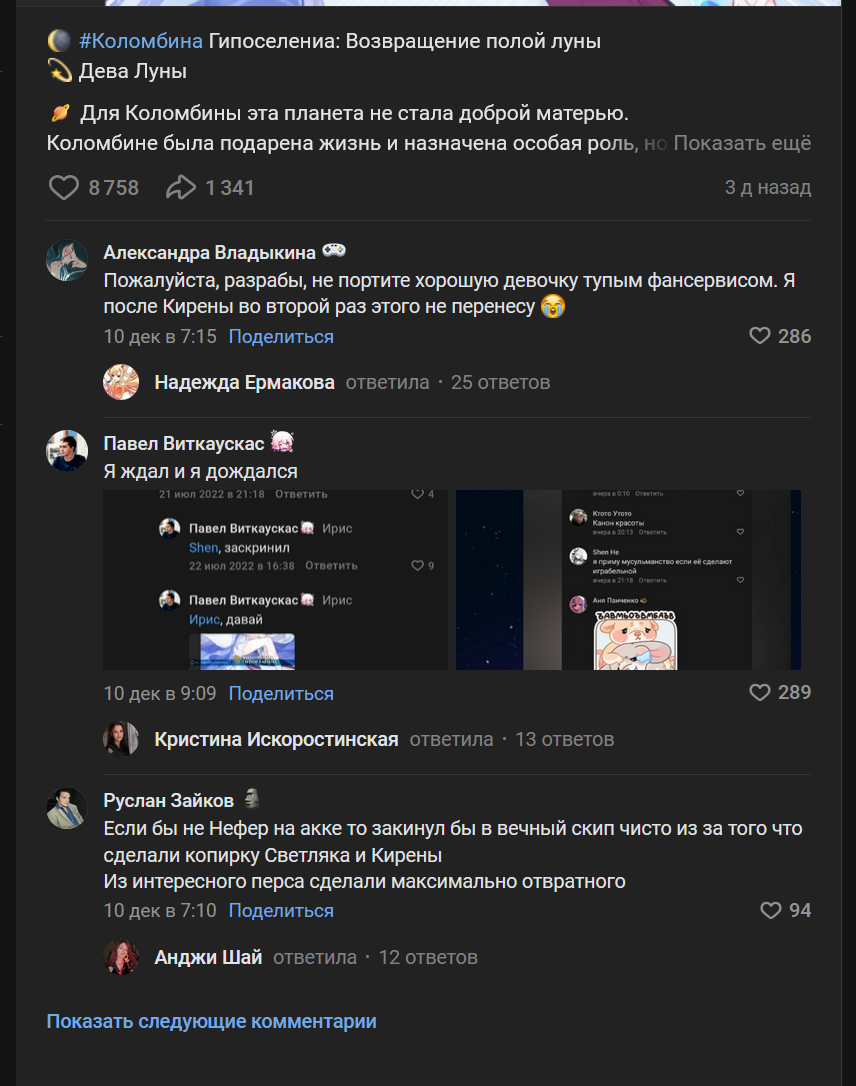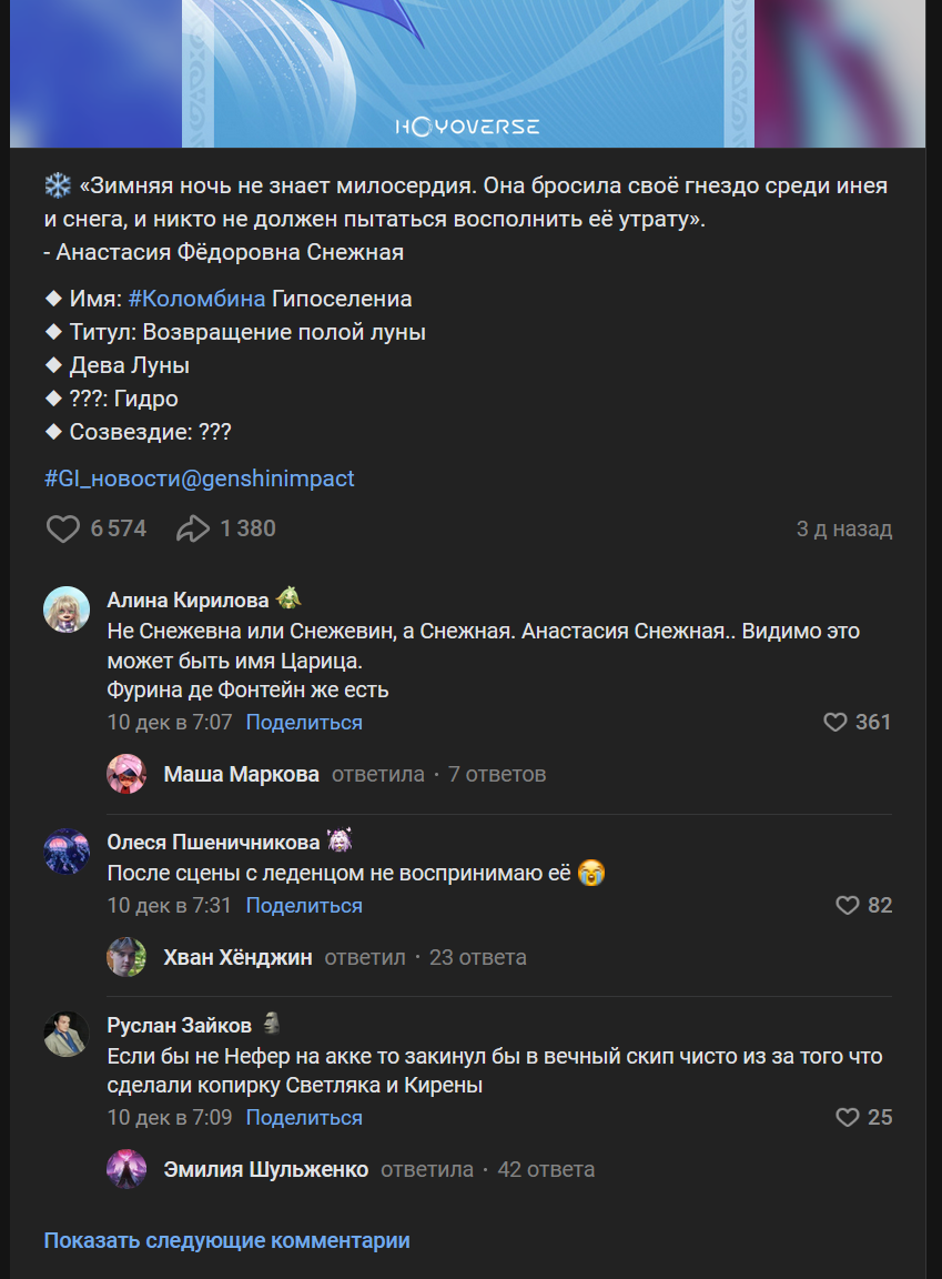 >>6050288 >минорные моменты если говорить за Коломбину, то довольно ожидаемо вышло, что одна сторона будет рваться, а другая >крутить на все гемчики продавать же надо как-то, да и тем более, сигнатурная девочка региона, да и вон, какая тишина была, стоило засветиться Клумбе с леденцом - все слои населения гашни возбудились А насчёт Натлана немного не понял, из-за агуши что-ль?