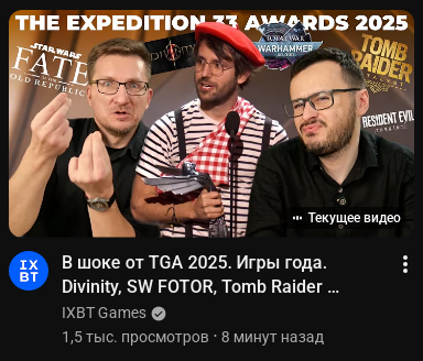 >>6049166 Чел, всем было похуй на победу вувы. Я посмотрел 30-40 стримов разных людей, как одиночек, так и групп, у большинства горело с того что Экспедиция все забрала, причем даже в тех номинациях типа инди игр, в которых не должна была вообще участвовать, не говоря о том, что были и другие достойные кондидаты на тот же звание рпг года - типа киндомкам 2 - это больше на рпг похоже чем экспедиция. Не редко были стримеры которые просто с облегчением вздыхали когда экспедиция проигрывала Вуве. Так что не надо ляля.