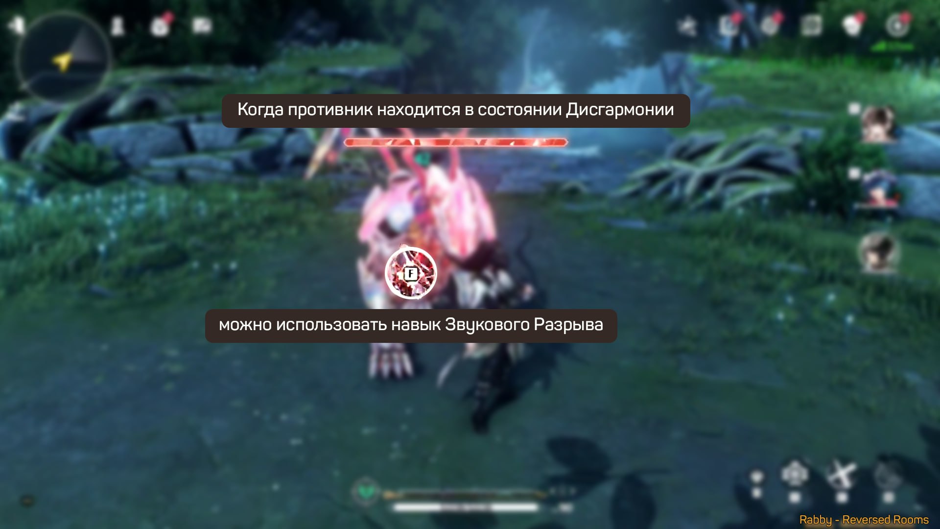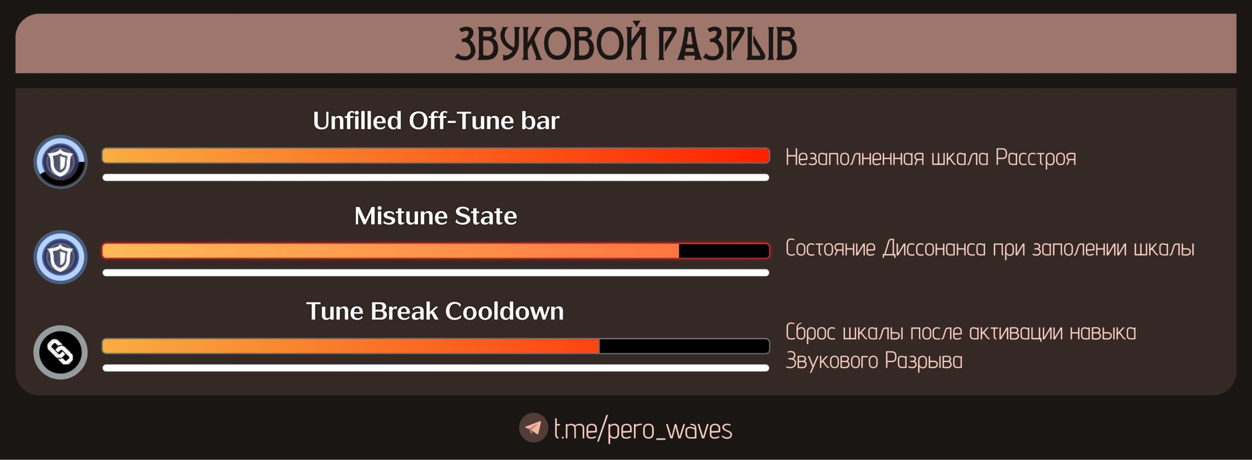 ➖ что будет когда мы заполним эту шкалу? 🤩 противник перейдет в состояние дисгармонии (mistune) и появится небольшое окно, во время которого можно активировать навык Звукового Разрыва. плюсом выкинется часть шкалы vibration strength и прервутся паттерны атак. 🤩 к выходу 3.0 этот навык будет доступен у всех (по сути, лишь сама его активация), для старых персонажей его анимация будет отличаться в зависимости от типа оружия. отдельные навыки с соответствующими плюшками будут предоставлены только новым персонажам.