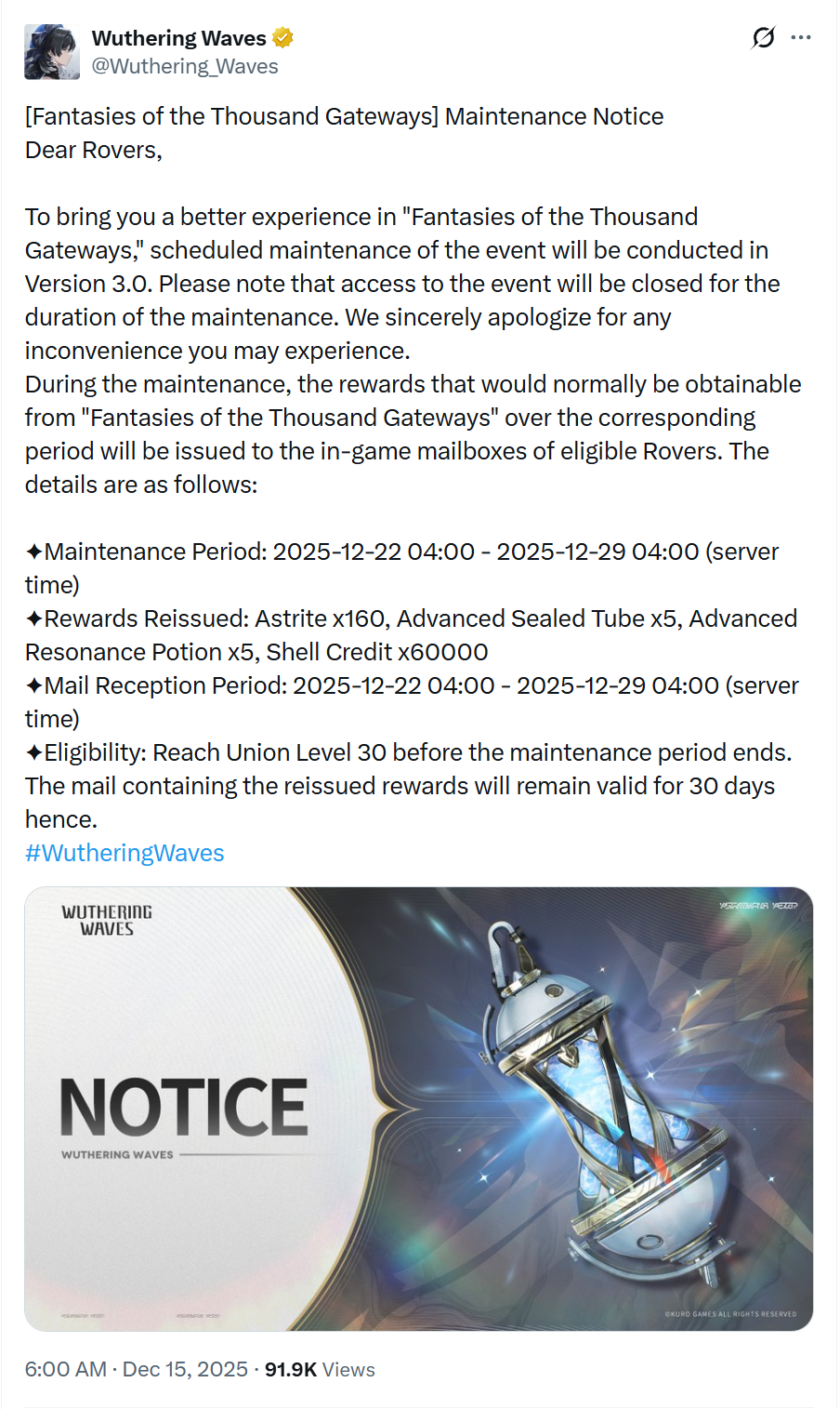 Для улучшения вашего игрового опыта в событии «Фантазии тысячи врат» в версии 3.0 будет проведено плановое техническое обслуживание. Обратите внимание, что доступ к событию будет закрыт на время проведения технического обслуживания. Приносим искренние извинения за любые неудобства, которые вы можете испытать. Во время технического обслуживания награды, которые обычно можно было бы получить в событии «Фантазии тысячи врат» в соответствующий период, будут отправлены в внутриигровые почтовые ящики соответствующих игроков. Подробности следующие: