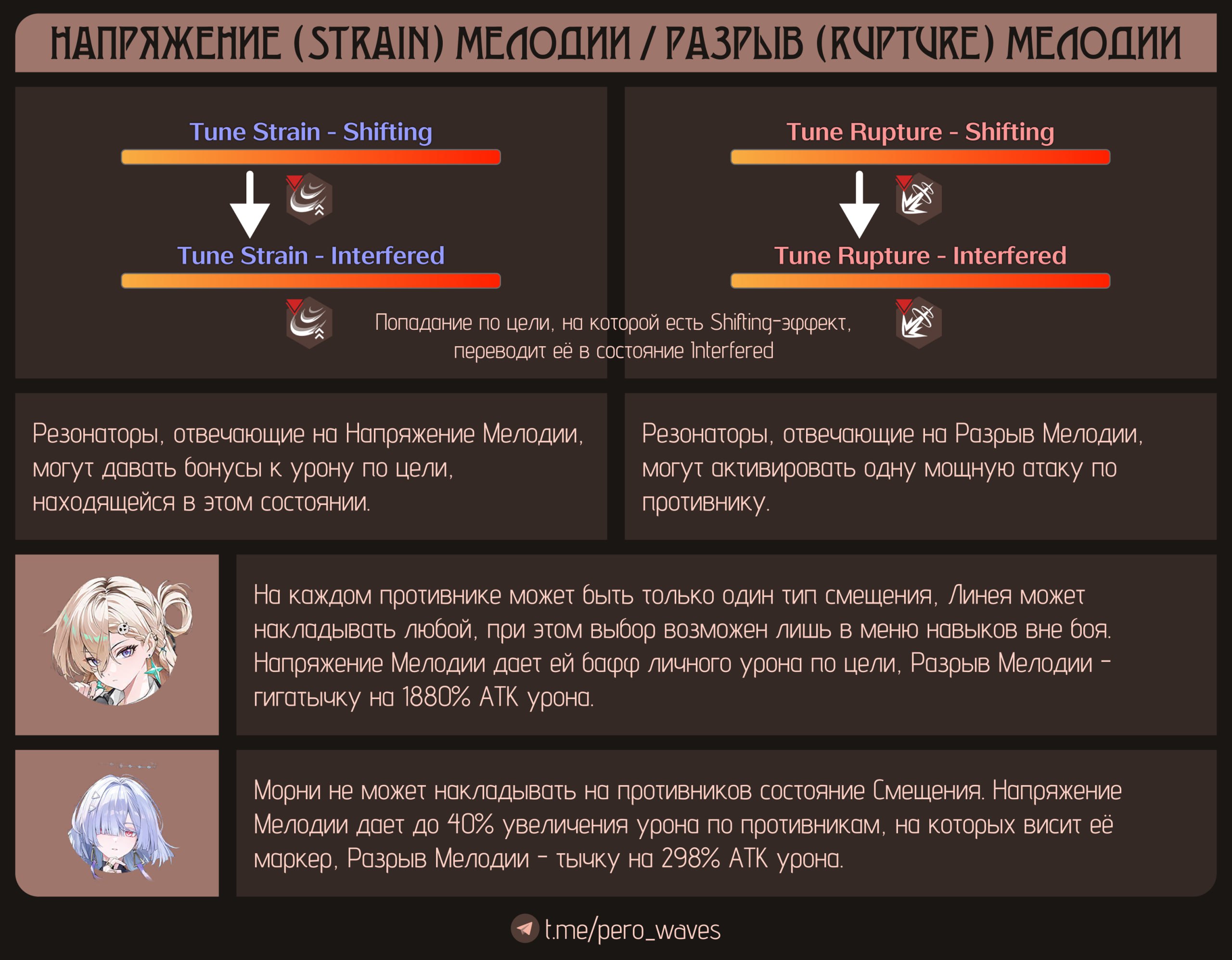 🤩 напряжение мелодии (tune strain): дает увеличение урона по цели. Морни может давать союзникам до 40% баффа урона, Линея — бафф личного урона. 🤩 разрыв мелодии (tune rupture): большая тычка с кучей урона, у Линеи это — 1880% урона за раз, у Морни — 300%.