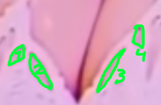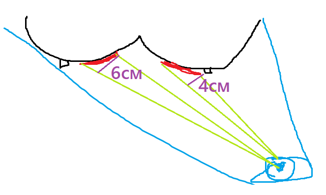На правой для зрителя сиське же там наклон плоскости такой, что дырка должна стать более узкой, что она и сделала. Но при этом она ещё и более длинной выглядит, чего быть не должно из-за наклона. Но этот эффект удлинения там просто из-за хуёвого качества фотки и, вероятно, невидимой на фотке полосы, забей на него. Там важнее то, что другугие дырки поменьше на разном расстоянии находятся (пик2).