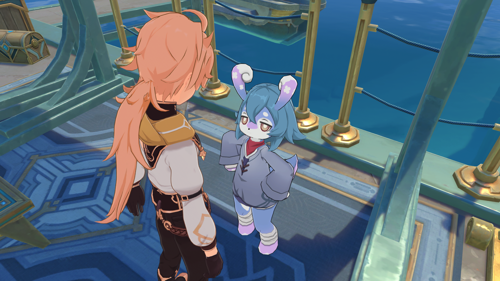 Месяц назад я наткнулся на эту ситуацию в пустыне Сумеру и заскринил. Она мне показалась забавной: идёт одинокий солдат фатуи, явно задание какое-то - караван вести. И так тяжело: жара, Солнце, песок, опасность пустынников... А тут ещё вот такая проблемная ситуация. Один баран почему-то развернулся и пошёл бодаться сзади идущим бараном. И вот стоят они, мычат, бодают друг друга, а солдат даже не заметил потери каравана.