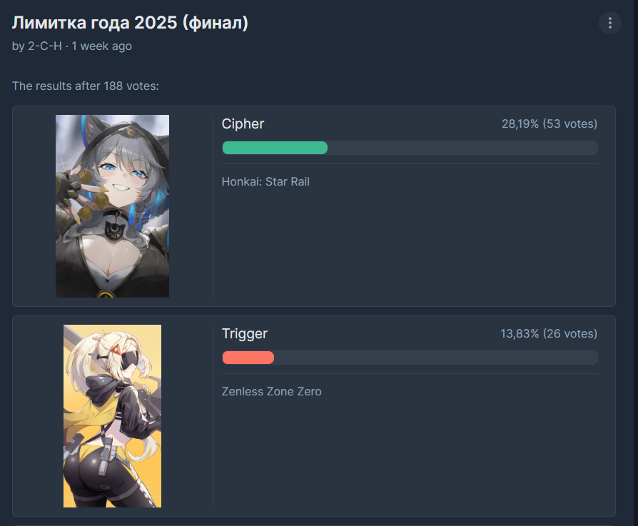 >>6087548 Котя и там победила, если смотреть по лимиткам 2025, у нас кста тоже, не понимаю зачем чел её накручивает, она и без наконфет в этом опросе на 1 месте