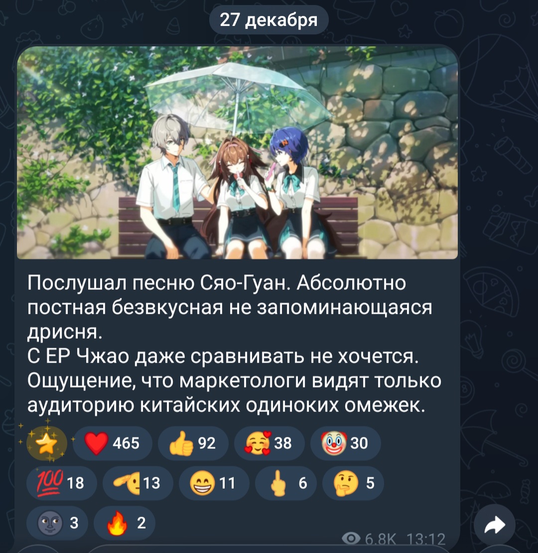 Послушал песню Сяо-Гуан. Абсолютно постная безвкусная не запоминающаяся дрисня. С EP Чжао даже сравнивать не хочется. Ощущение, что маркетологи видят только аудиторию китайских одиноких омежек.