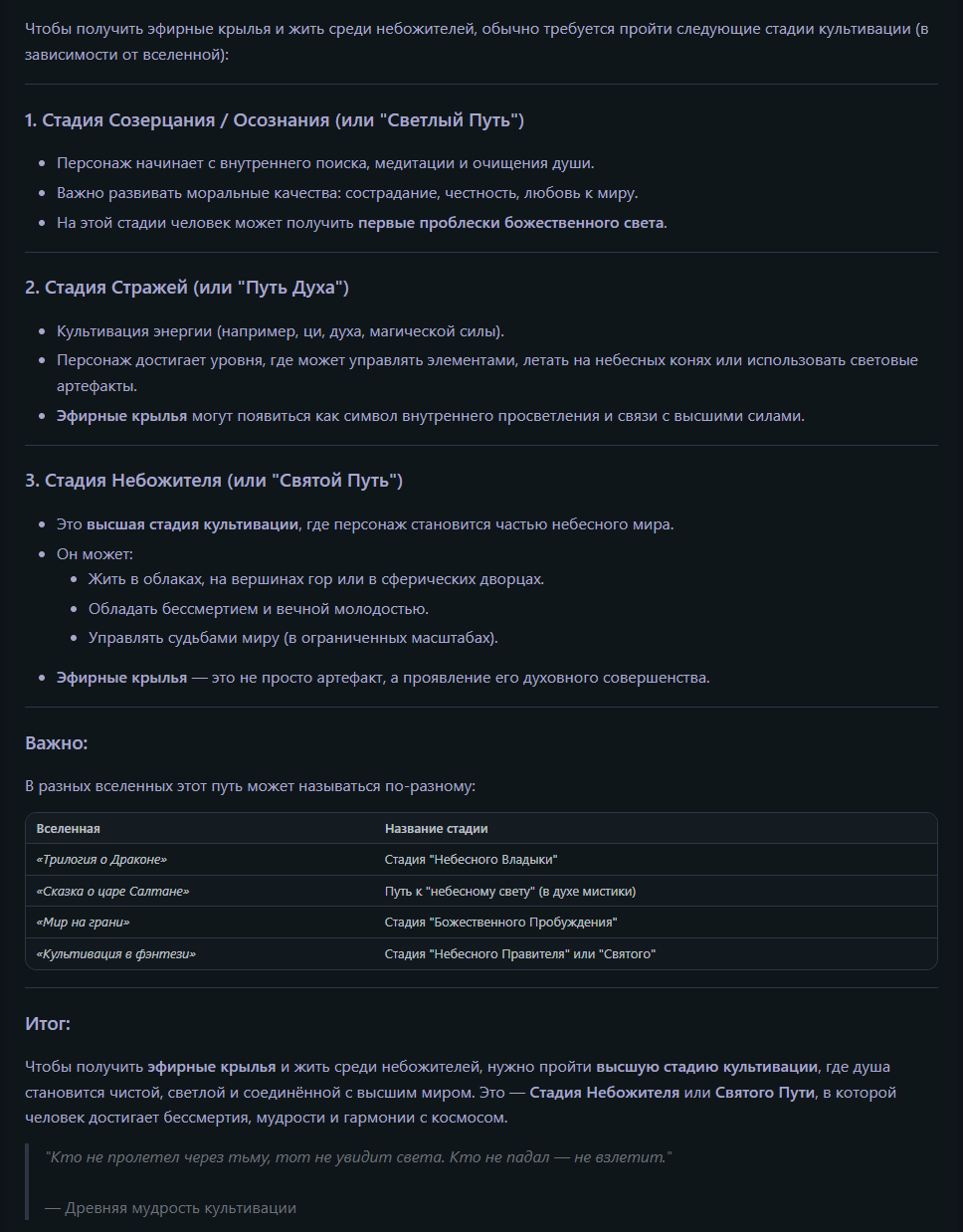 Вознесение: Конечная цель культивации — достижение божественного статуса или становление бессмертным, часто путем «вознесения на Небеса». Небеса: Мистические сферы или высшие царства, куда культиваторы стремятся попасть после достижения высочайших уровней силы.