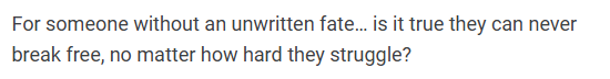 >>6121656 Кто-то без ненаписанной судьбы <т.е. не Ровер, чья судьба - чистый лист> ... правда ли что они никогда не смогут стать свободными <от судьбы>, как сильно бы они не боролись?