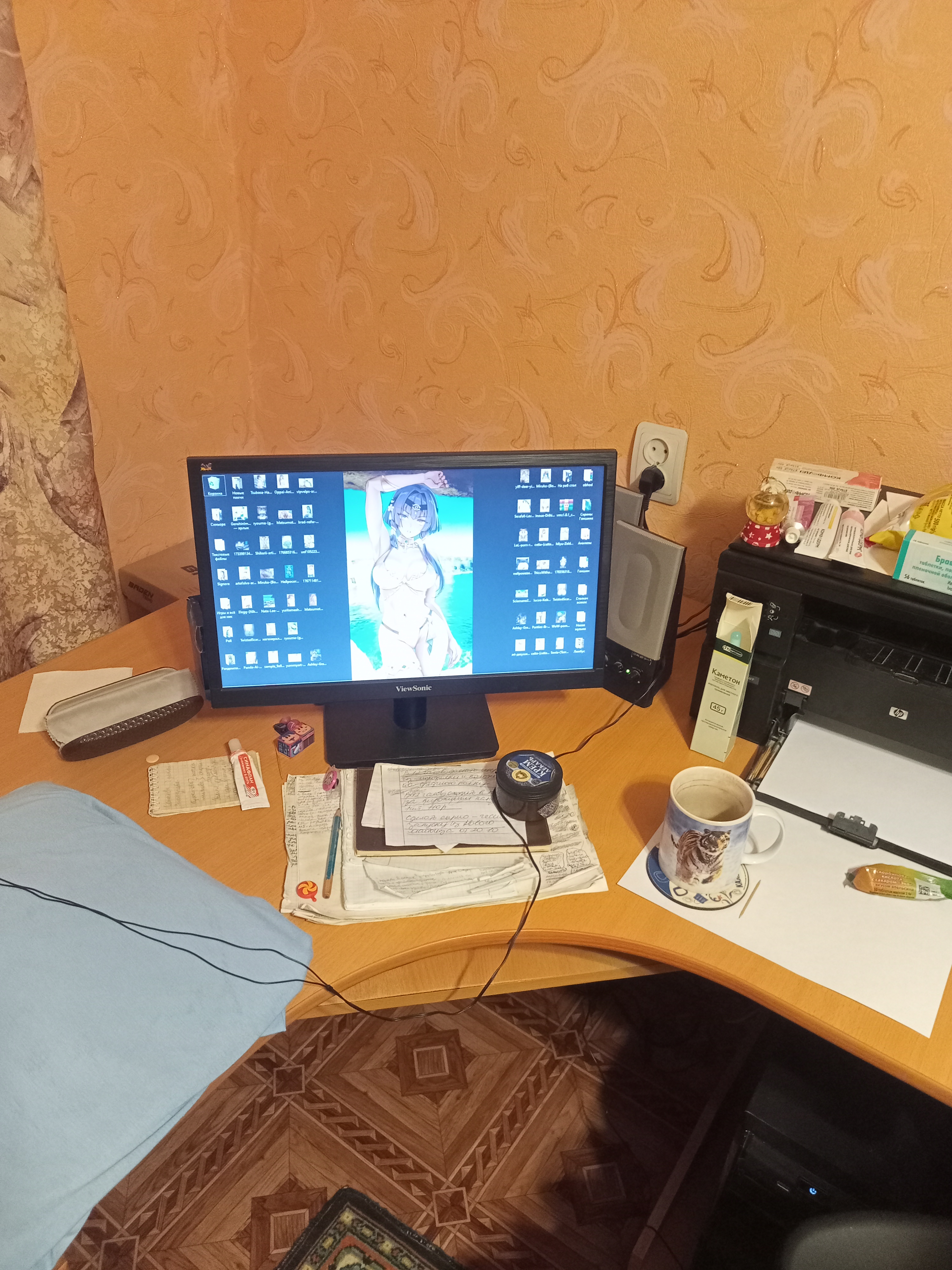 Стол со столешницей 80х150. На столе коврик Xiaomi MIIW, на нём клавиатура A4Tech FX60H и Крысюань Logitech G502. За ковриком основной монитор Redmi G Pro 27", справа от него вплотную второй монитор Asus VG259Q. По сторонам от основного монитора две колонки от системы Sven SPS-820, которые подключены к китайскому усилку на базе схемы TA-2024 который тюльпаном подключен к звуковухе Creative Surround X-Fi 5.1 Pro. Рядом с усилком - вторая звуковуха Fiio K5 Pro, к ней подключены наушники Fiio FT1 которые рядом на подставке. Рядом на столе телефон Oneplus 12 (старшая версия вжушкофона), а рядом с ним - кейс с наушниками Oneplus Buds 3. Над основным монитором висит на стене телевизор LG C4 42" который полгода использовался как монитор, но несмотря на все плюсы оледа Новогоднее настроение за выгорание победила, поэтому изредка включается для кинца. Сбоку от стола две пекарни. Первая - основная, вторая - NAS-файлопомойка, которая работает от ИБП Ippon BlackPower 600 Pro, который подключен к 2кВт-стабилизатору. Перед столом кресло Метта ErgoLife Comfort.